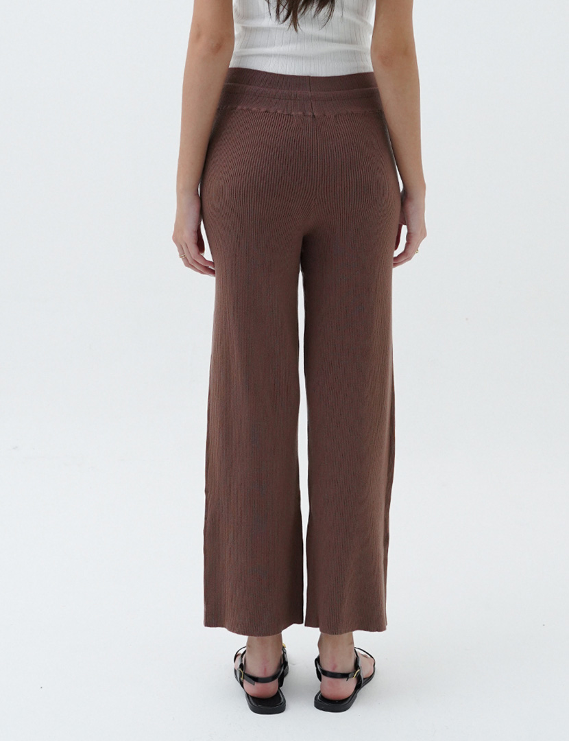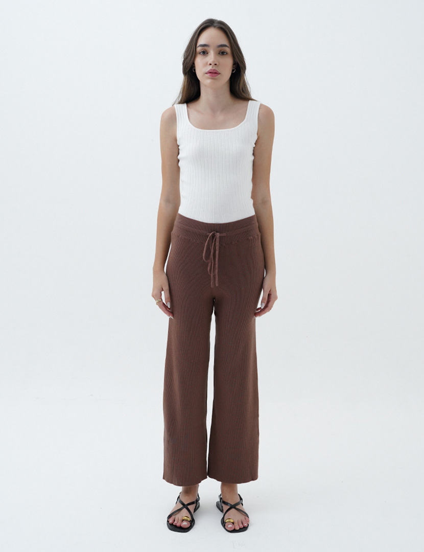 Casual straight cut pants with soft knit fabric wide elastic waistband with an outer drawstring.