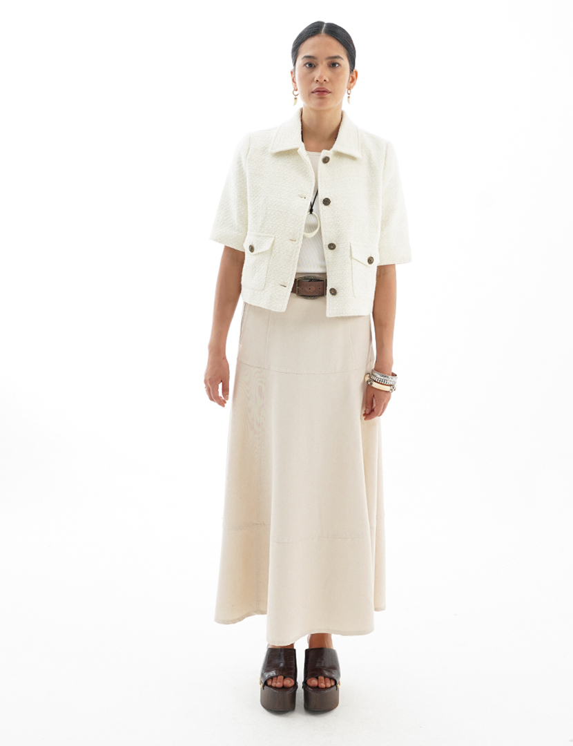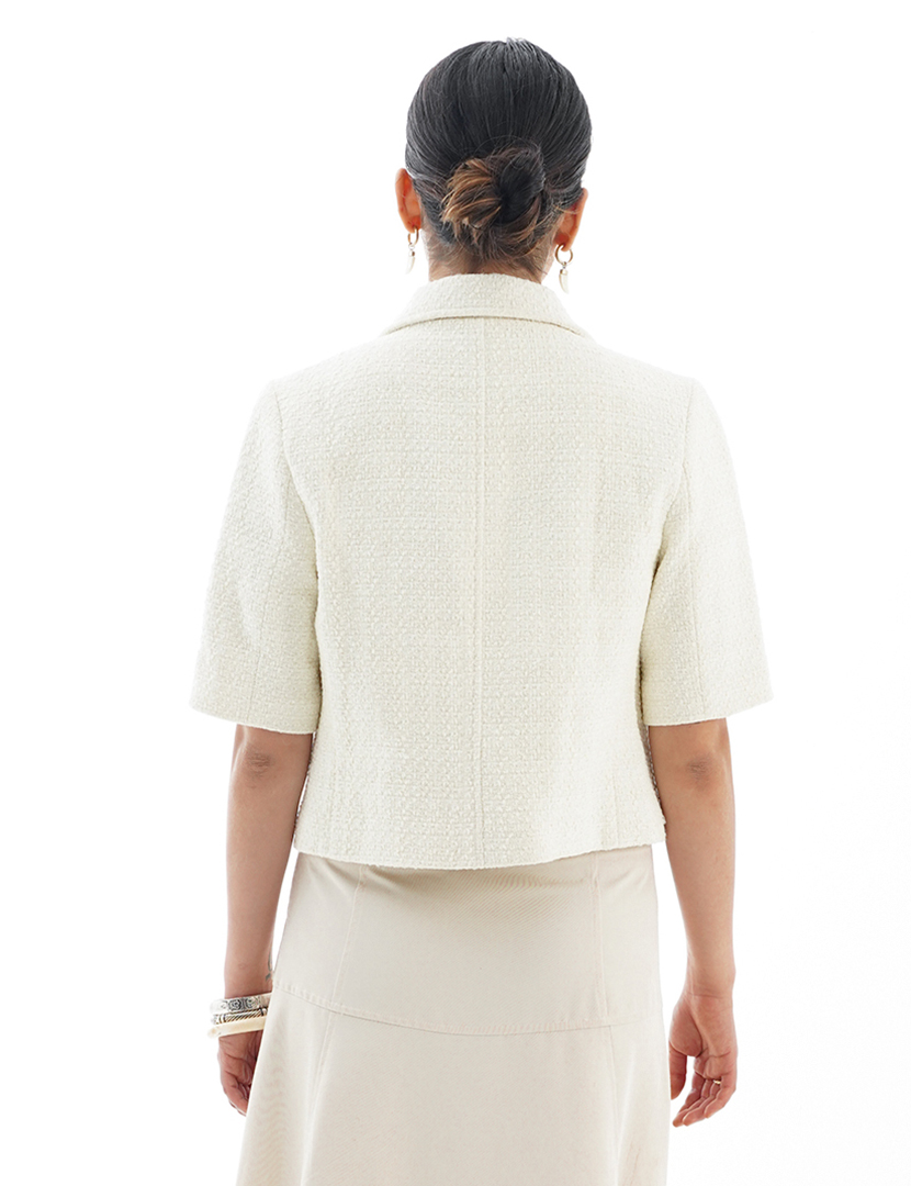 Short sleeves jacket with the cropped length, single breasted, and front button fastening.
