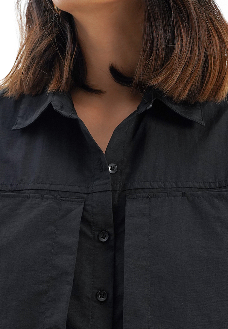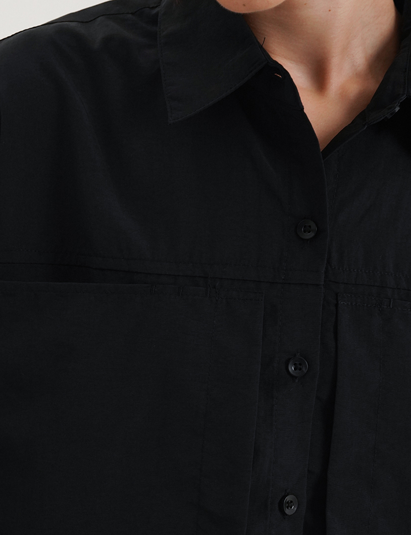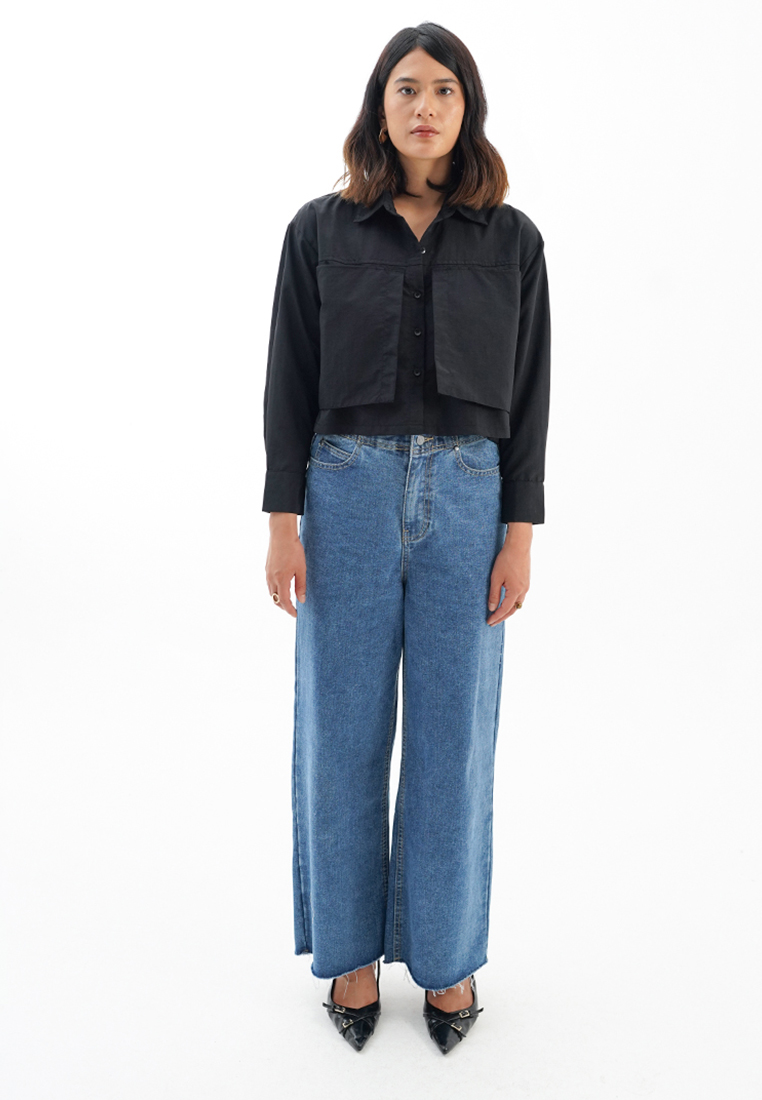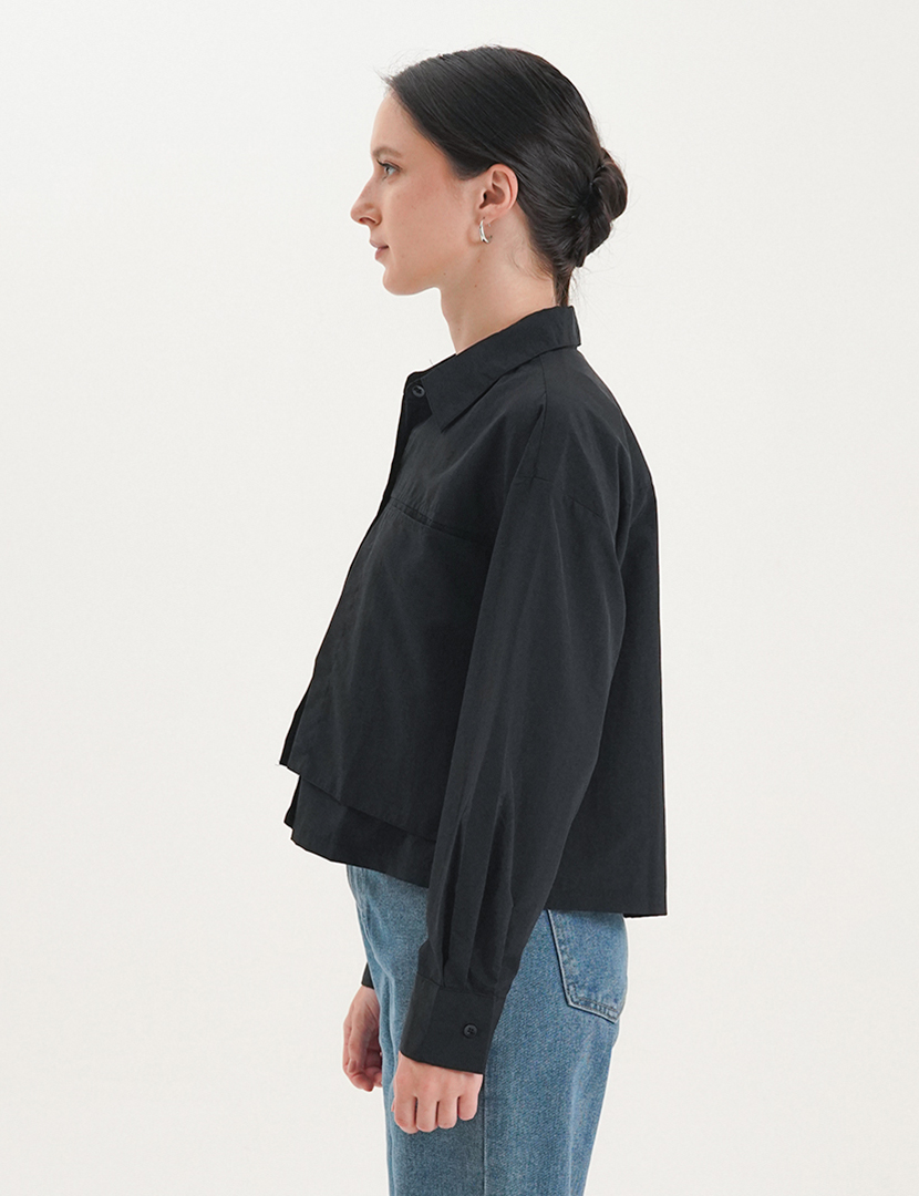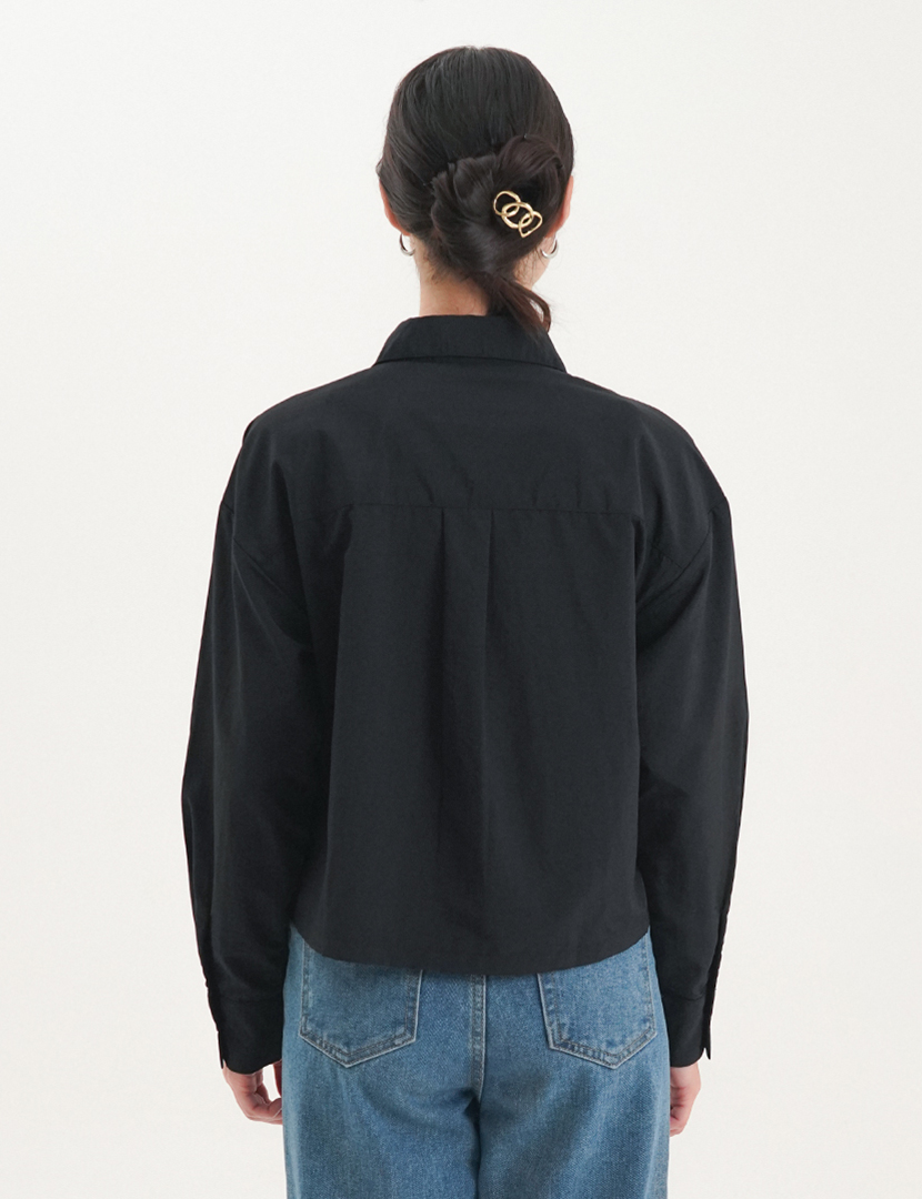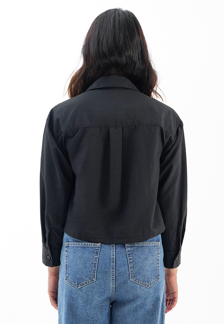 Cropped collared shirt with long sleeves. Button up front with Lapel Patch Detail