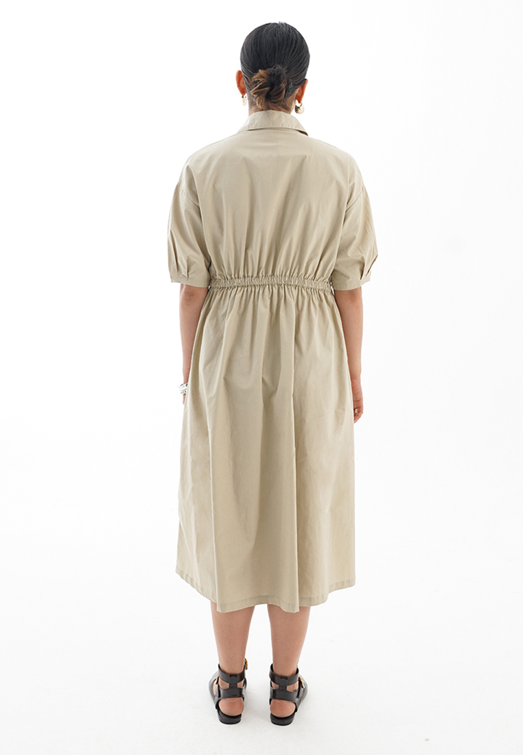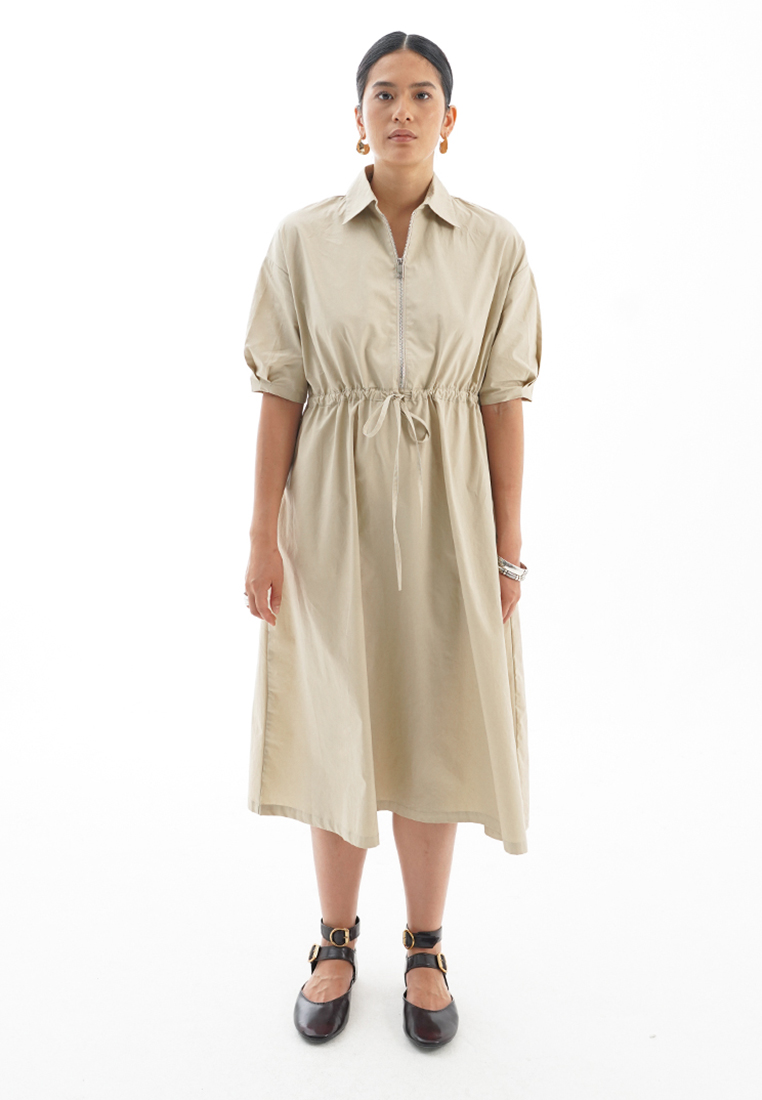 Midi Dress with a loose fit, use the adjustable drawstring to cinch in at the waistand, A zip-up fron