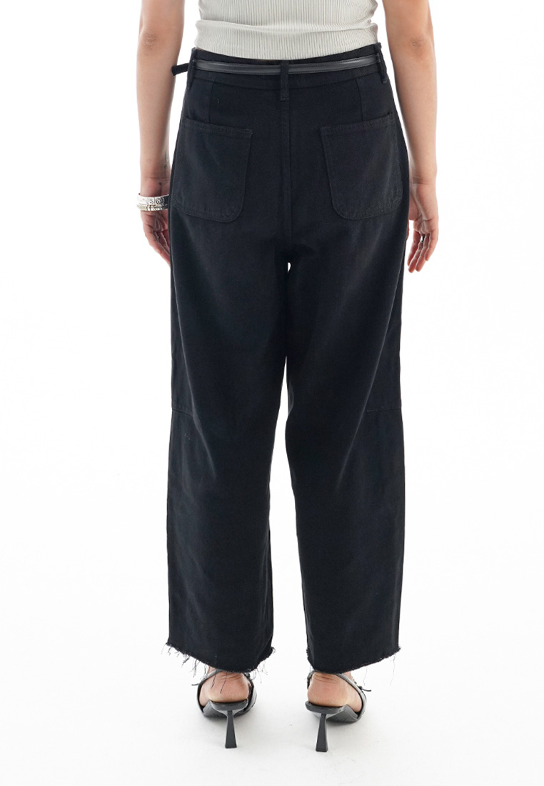 High-waist jeans with patch pockets on the back. Raw-edge hems. Zip fly and button fastening