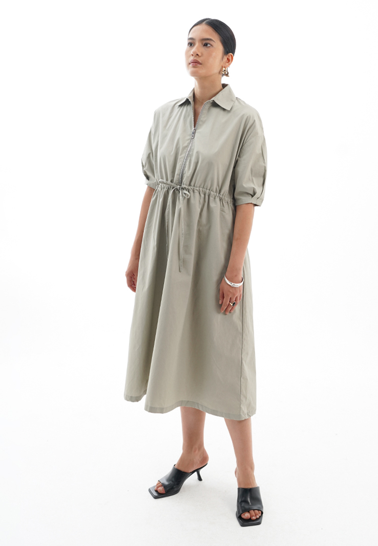 Midi Dress with a loose fit, use the adjustable drawstring to cinch in at the waistand, A zip-up fron