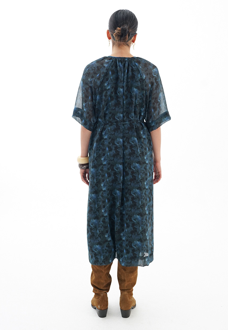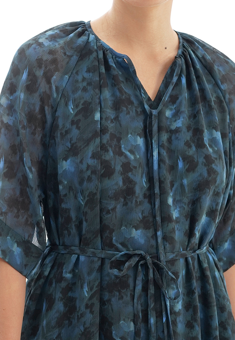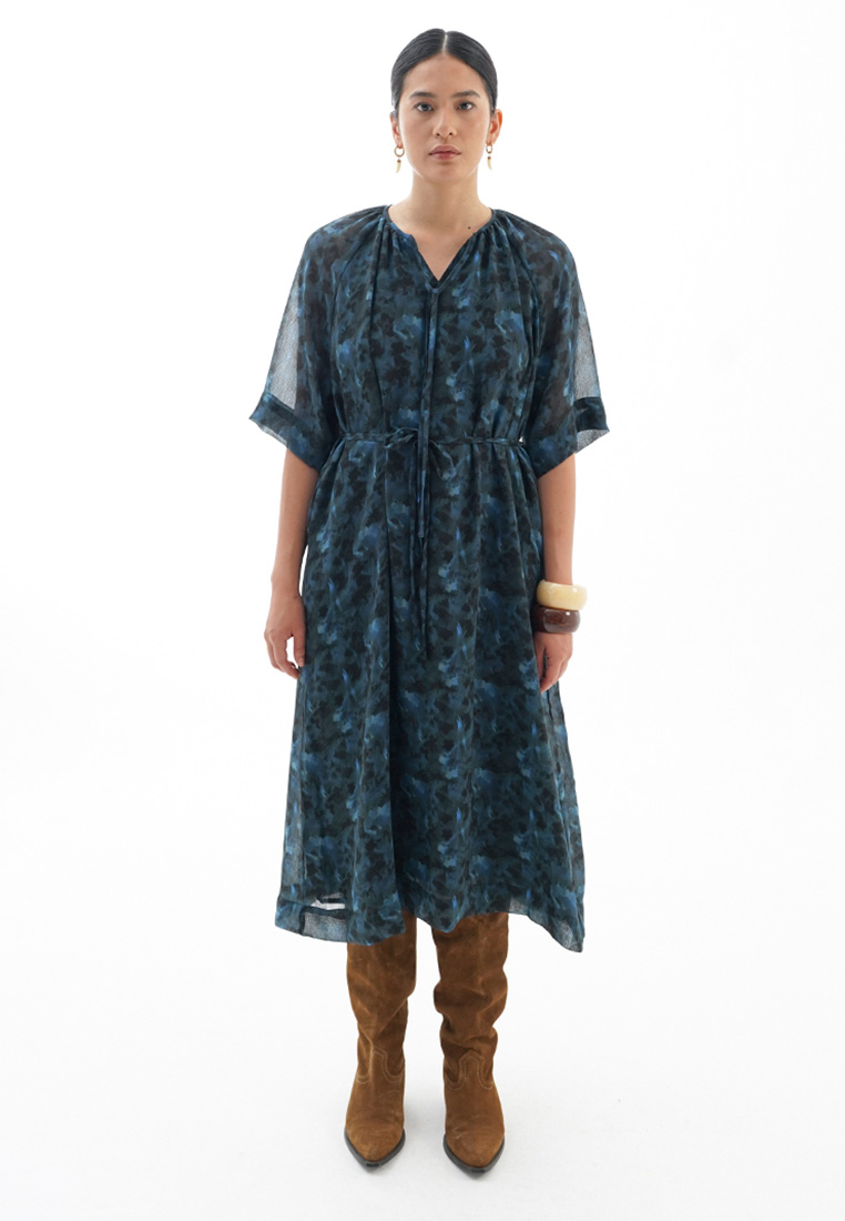 Relaxed fit V-neckline Midi dress with rope cord detail Flared 3/4 sleeves