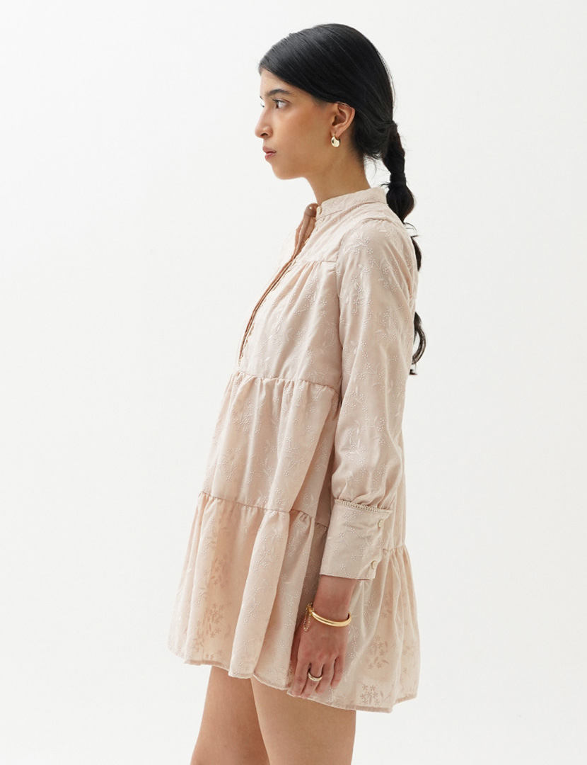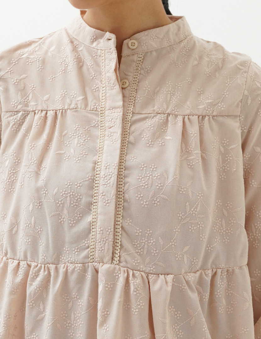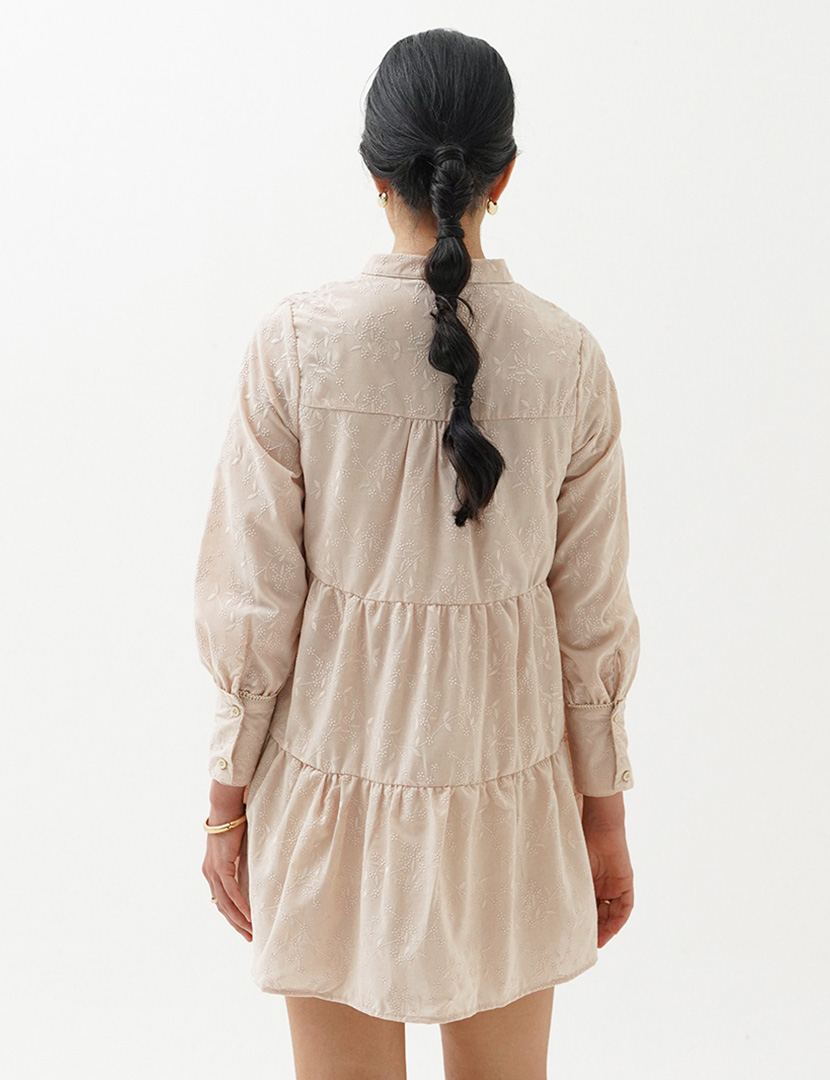 Layered dress with long sleeve detail, combined with matching trims at centre front and cuff, front button for the opening.