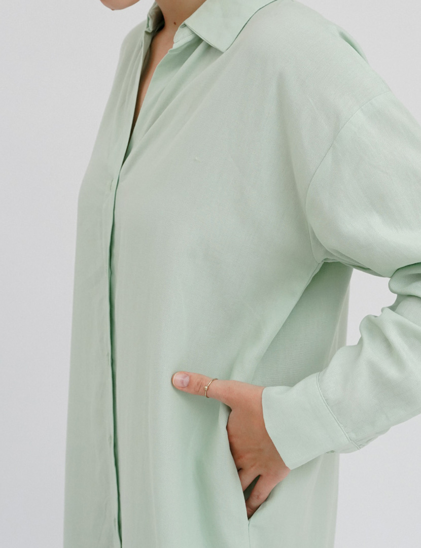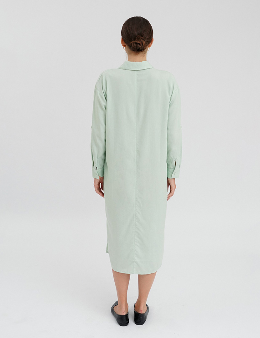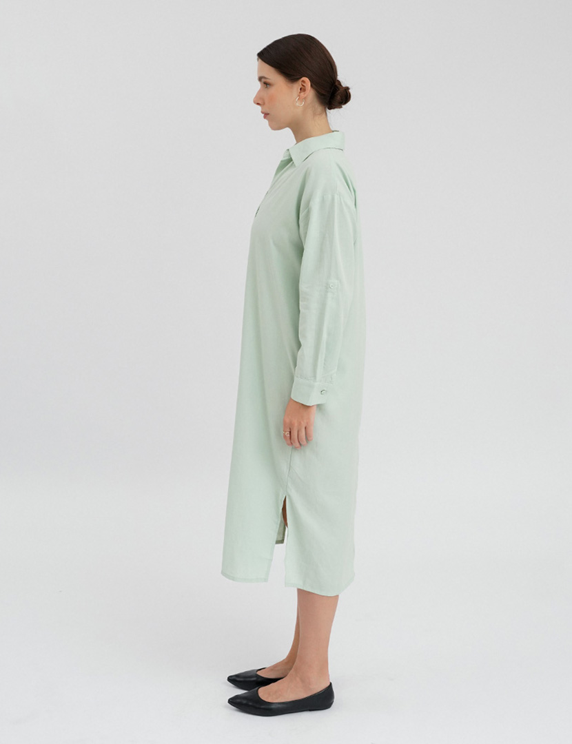 Dress made of a linen blend fabric. Johnny collar and sleeves falling below the elbow with turn-up cuffs, tabs and buttons.