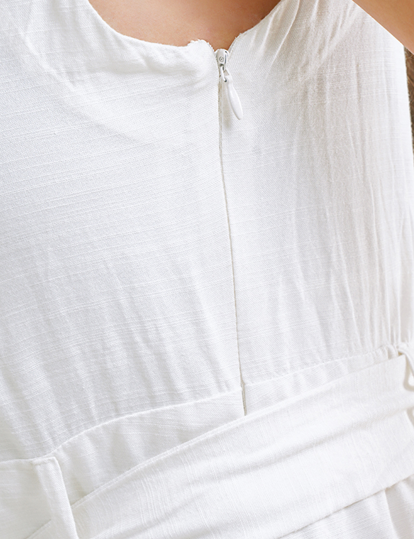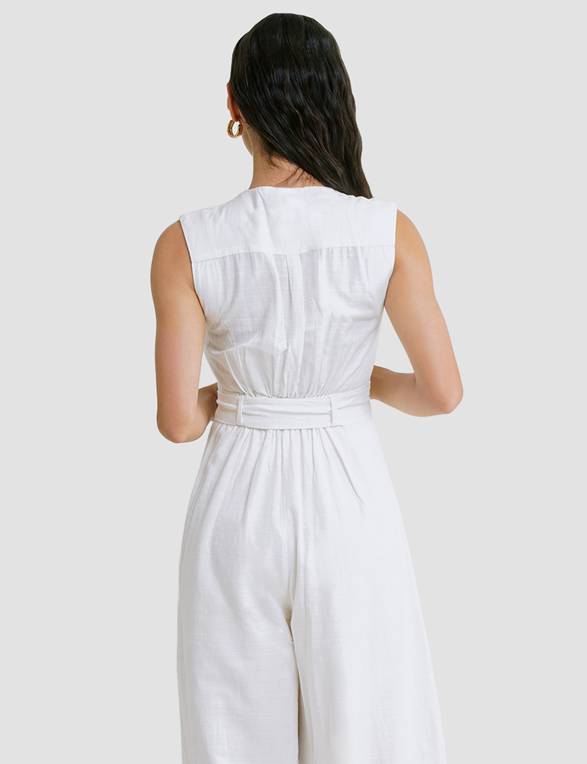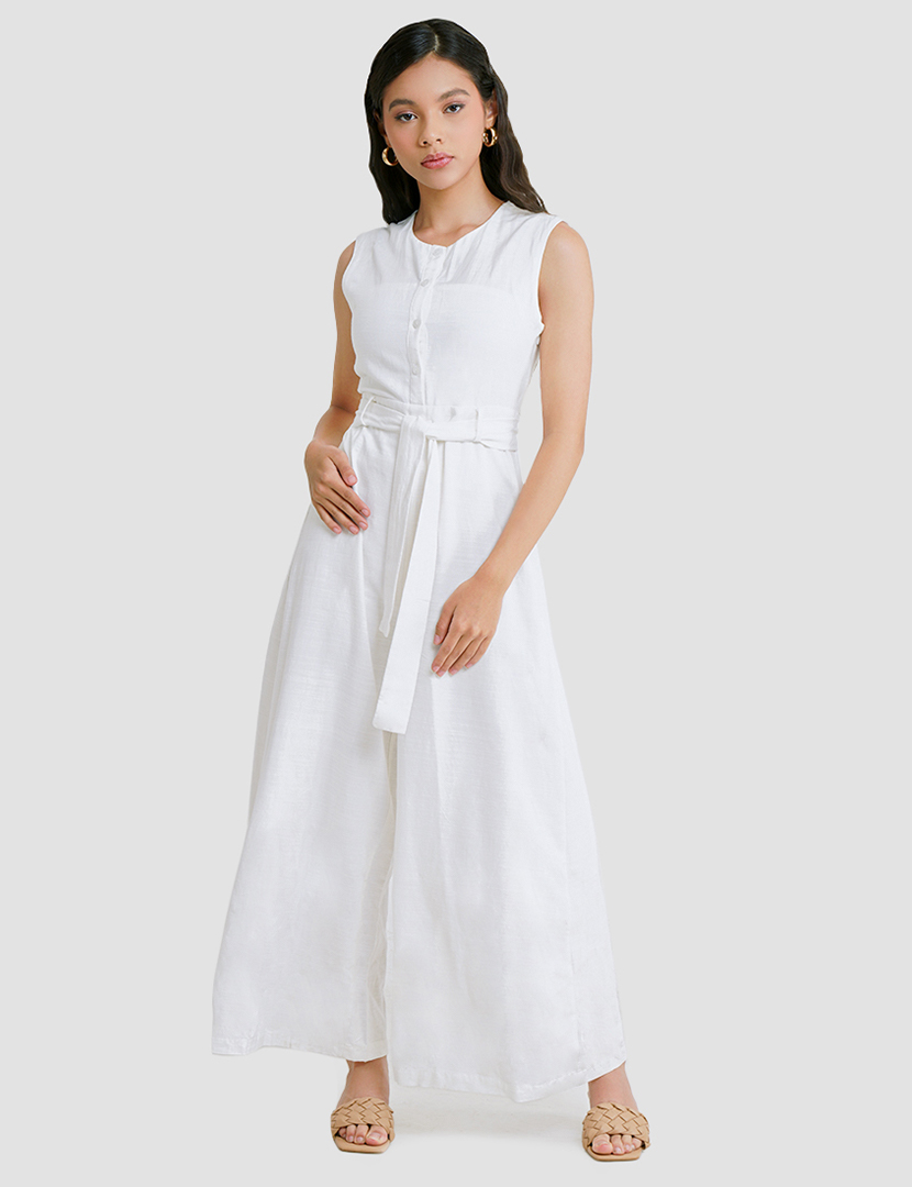Linen jumpsuit featuring sleeveless and long wide leg trousers with button opening at the front.
