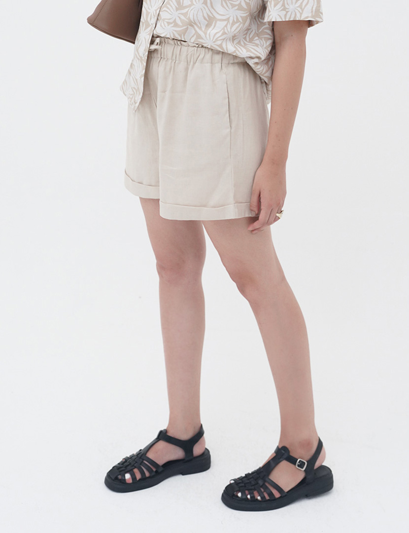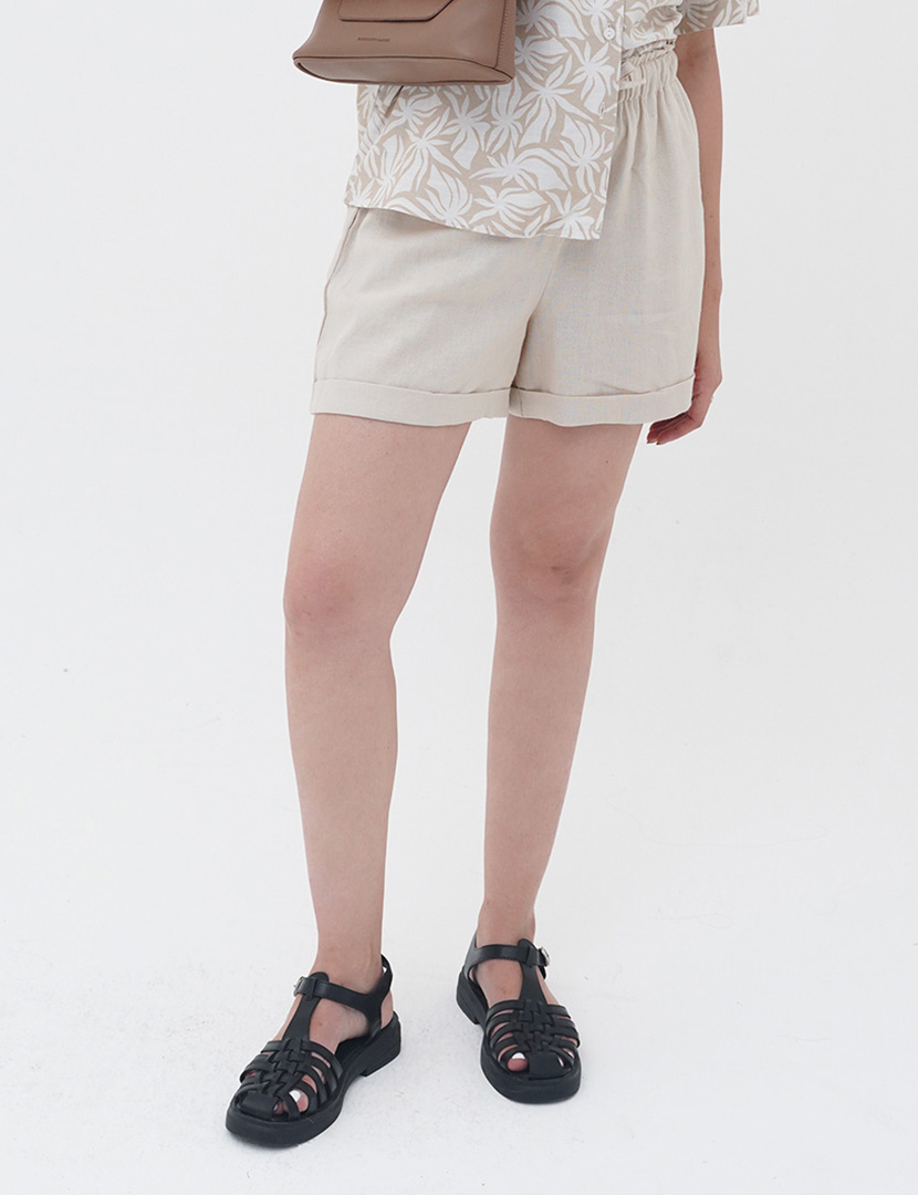 High waist shorts pants linen with detail roll up, adjustable elastic drawstring waistband and front pockets.