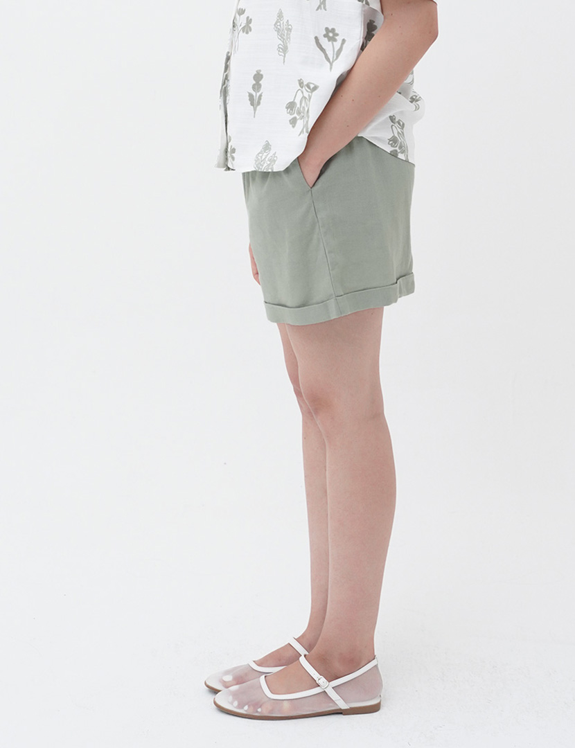 High waist shorts pants linen with detail roll up, adjustable elastic drawstring waistband and front pockets.