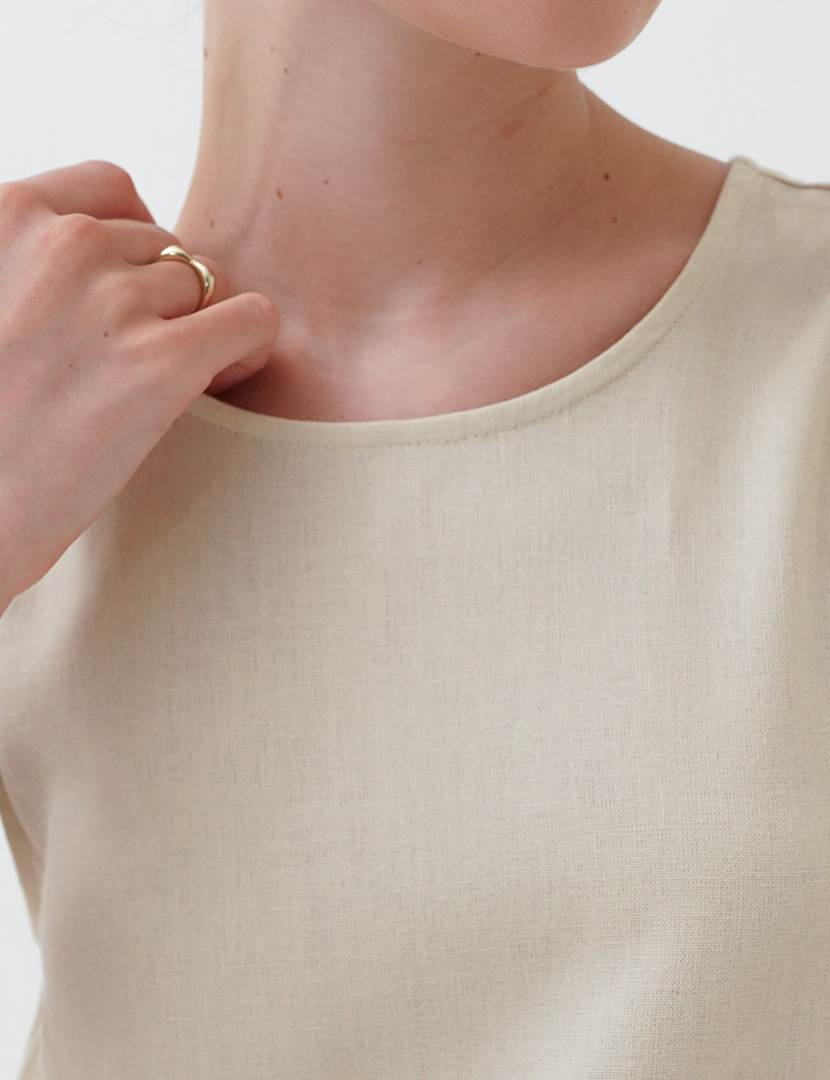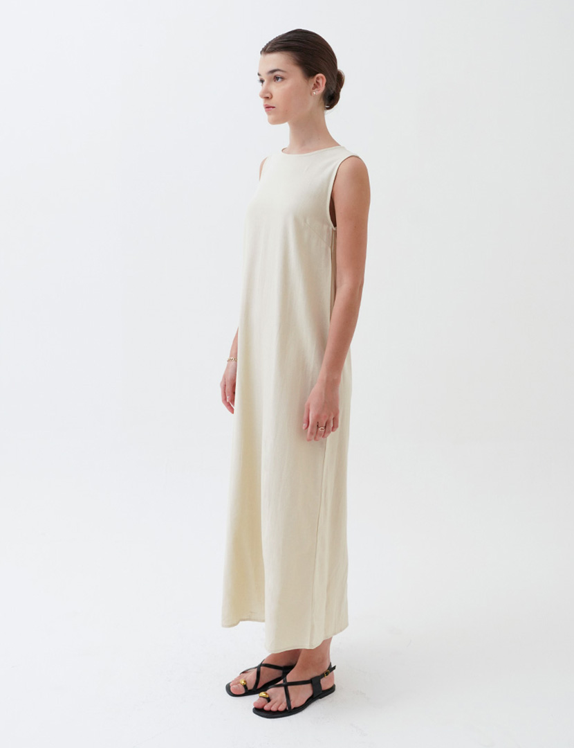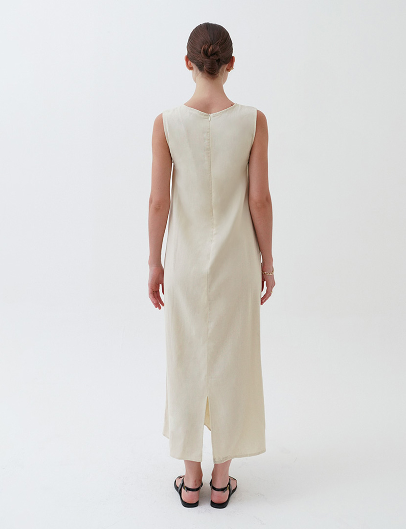 Sleeveless round neck midi dress made of linen fabric. Invisible back zip fastening.