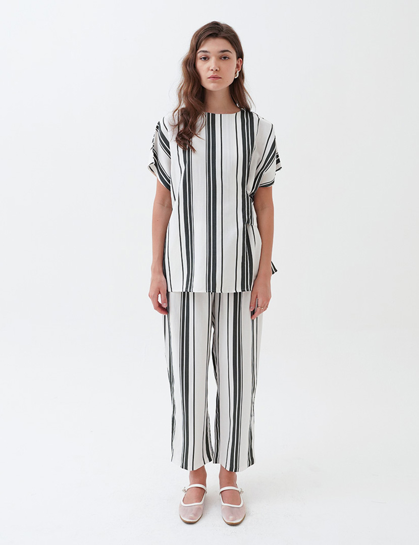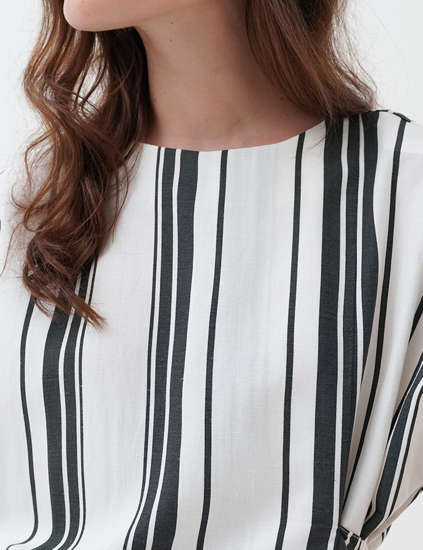 Blouse with relaxed silhouette, crew neckline with zipper at back, wide shoulder, cap sleeves, self wrap tie at the waist.