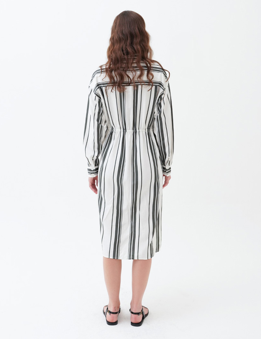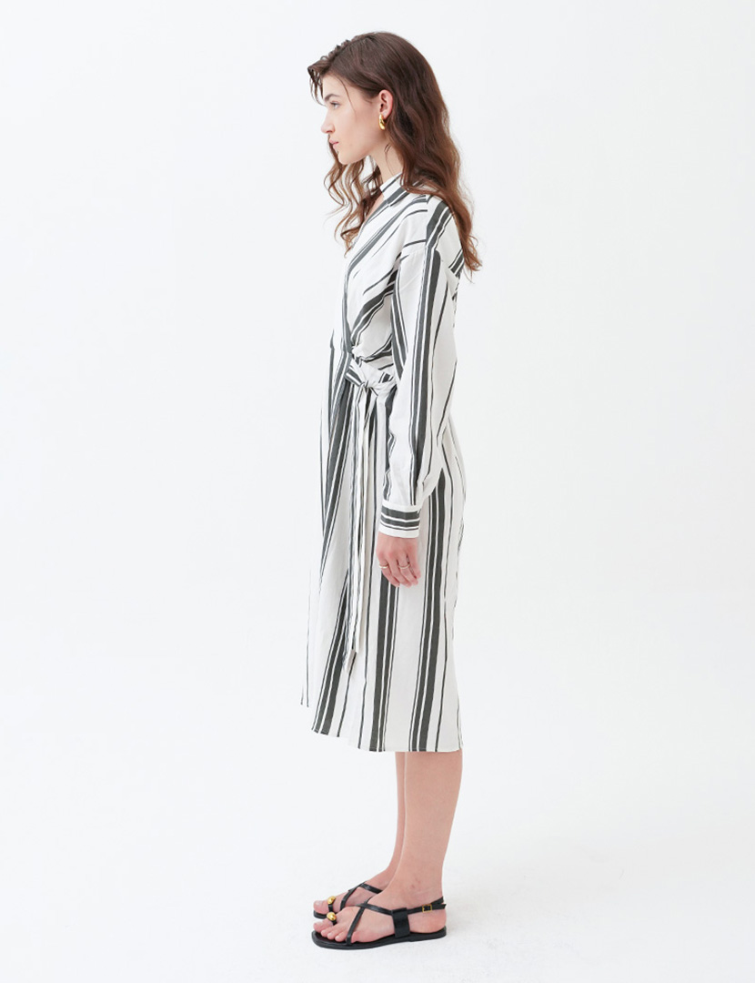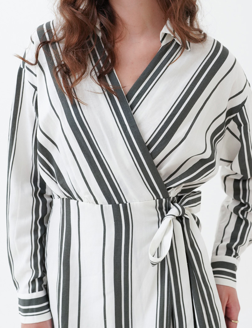 Midi Dress with stripes linen fabric. Long sleeves and wrap-style fastening at the side with a blet with the same fabric.