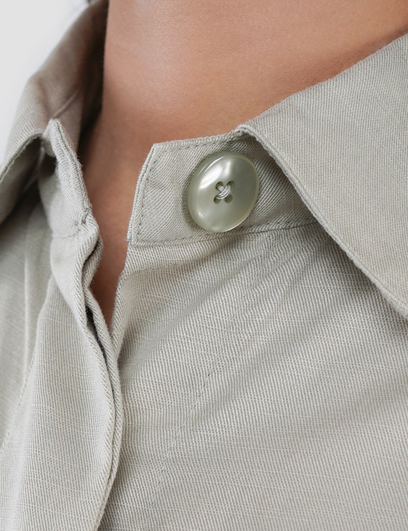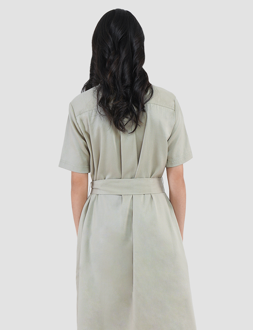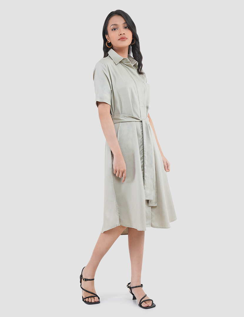 Collared midi dress featuring short sleeves with knot in the same fabric, front patch pockets, hidden button-up front.