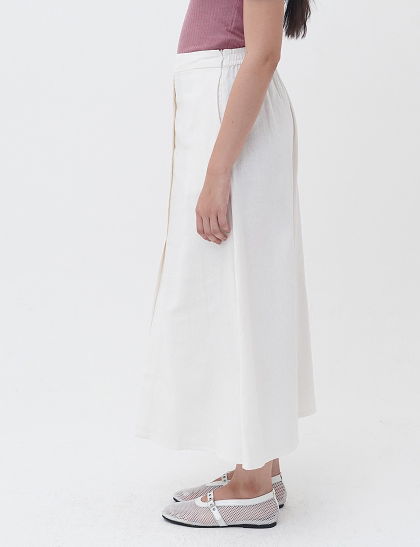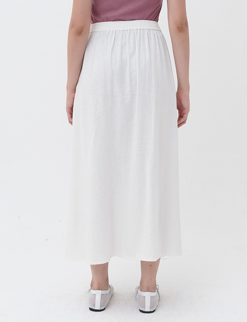 Midi skirt with a front slit, a-line silhouette, hidden in-seam zip closure.