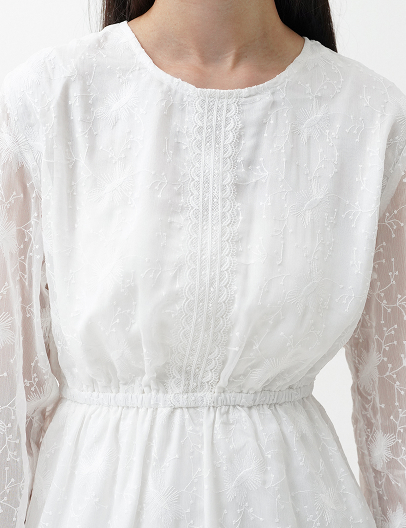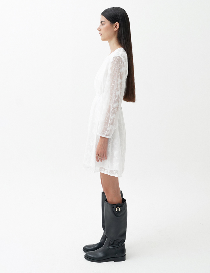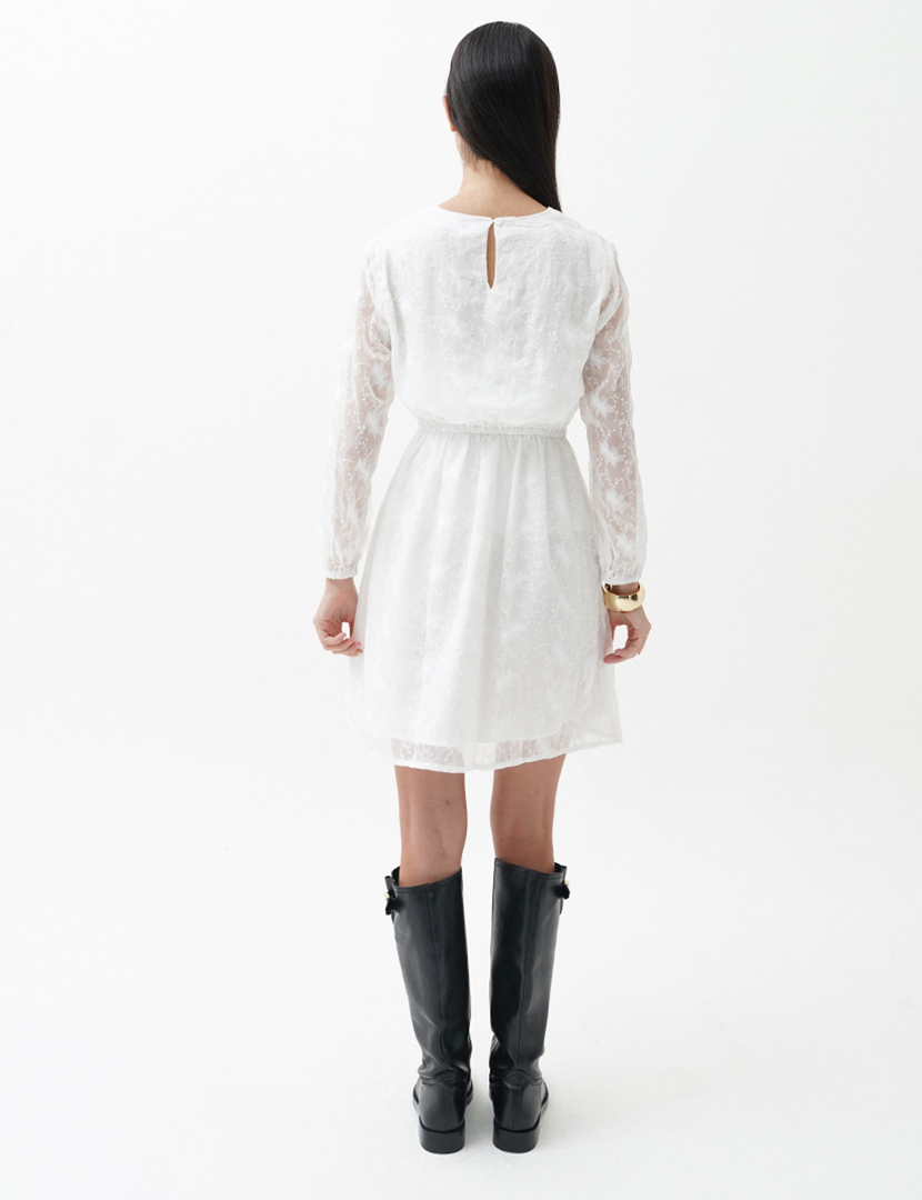 Short dress featuring a crew collar, sleeves falling below the elbow with elastic trims and back fastening with matching buttons.