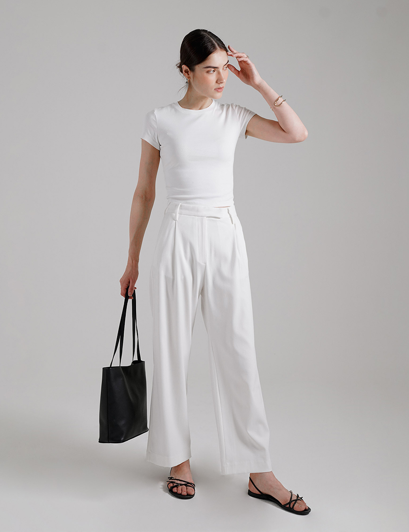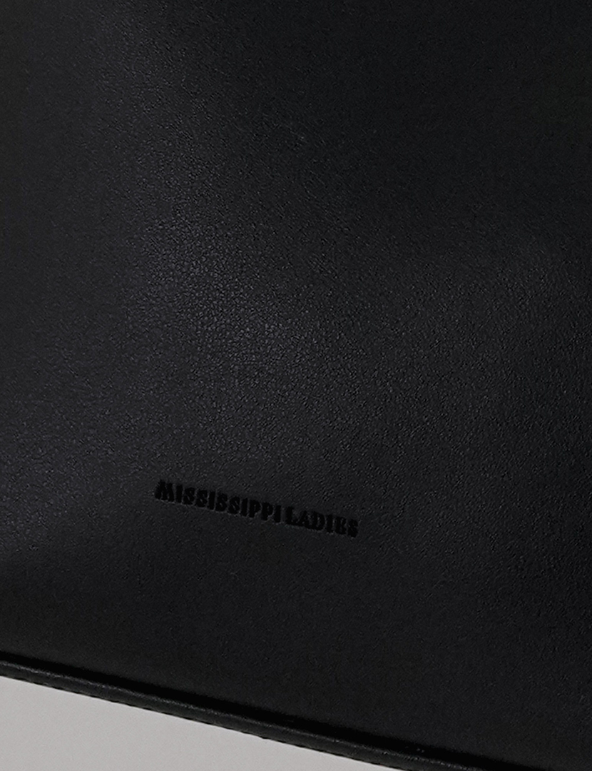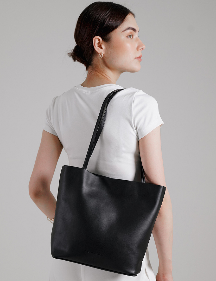 Minimalist leather tote bag with shoulder strap, lining, magnetic clasp closure.