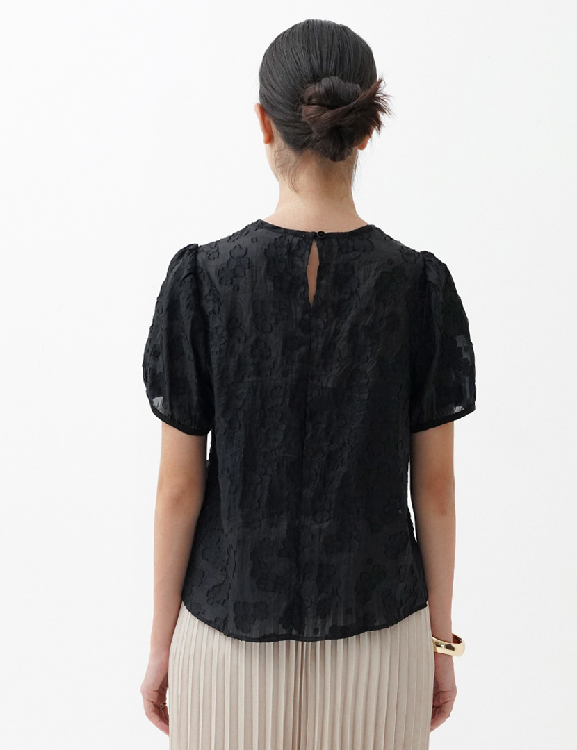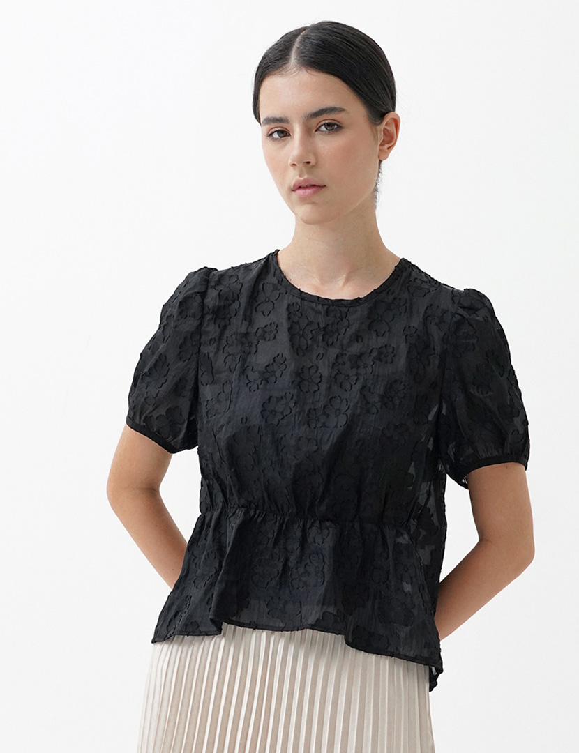 Round neck blouse with short balloon sleeves, gathered symmetrical front hem, back opening with button closure.