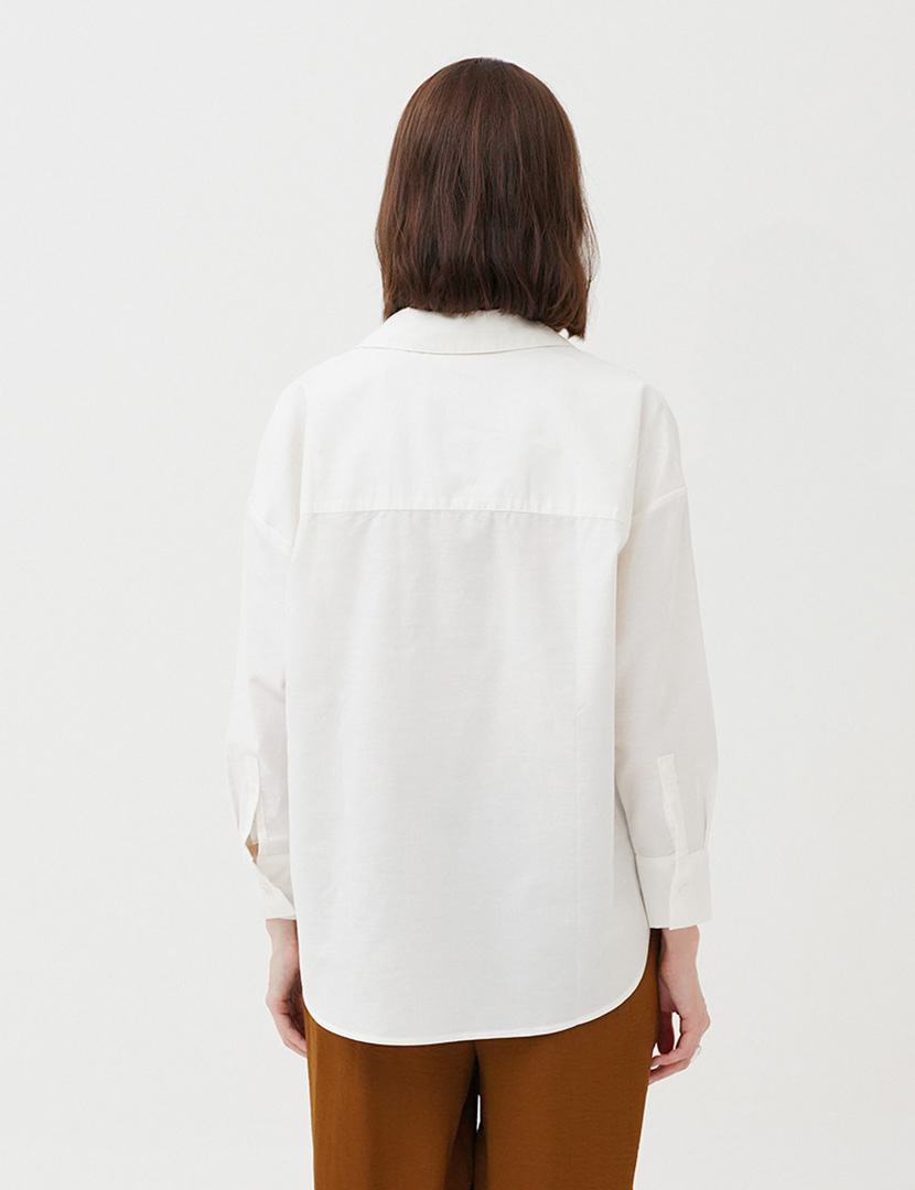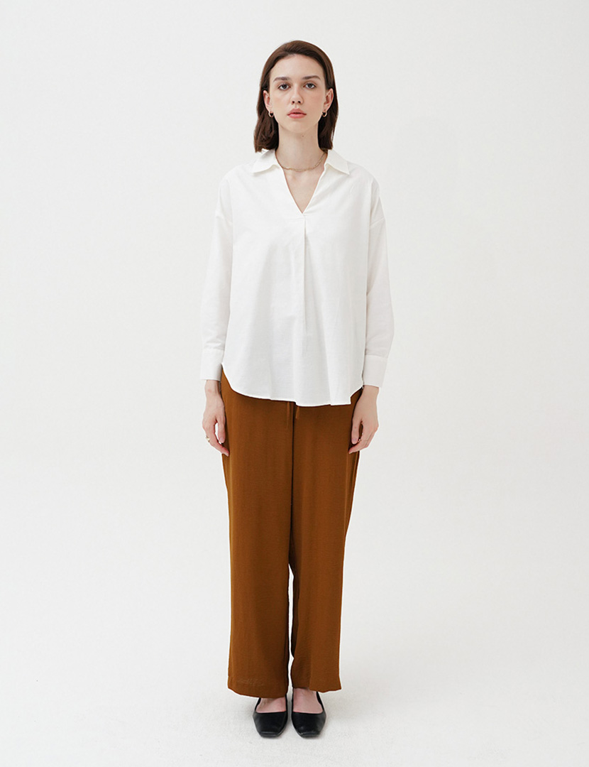 Oversized blouse with v-neckline collar, and long cuffed sleeves. Pleat detail in the front, Asymmetric hem.