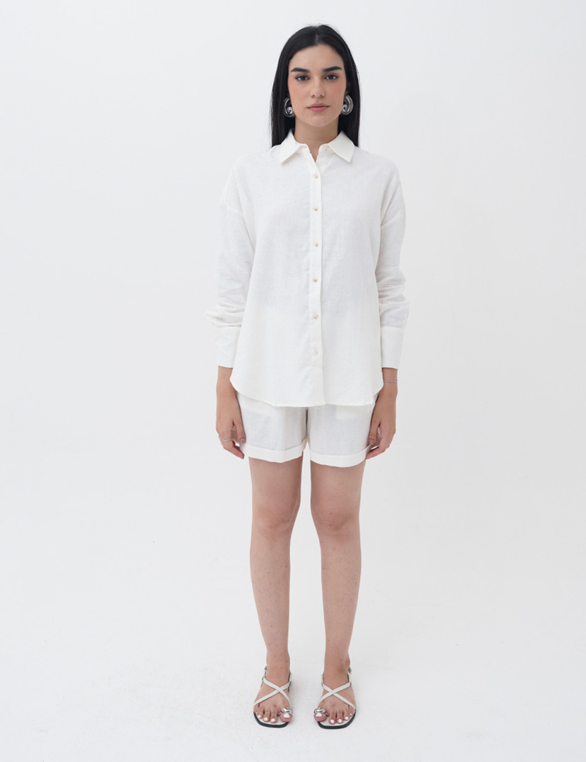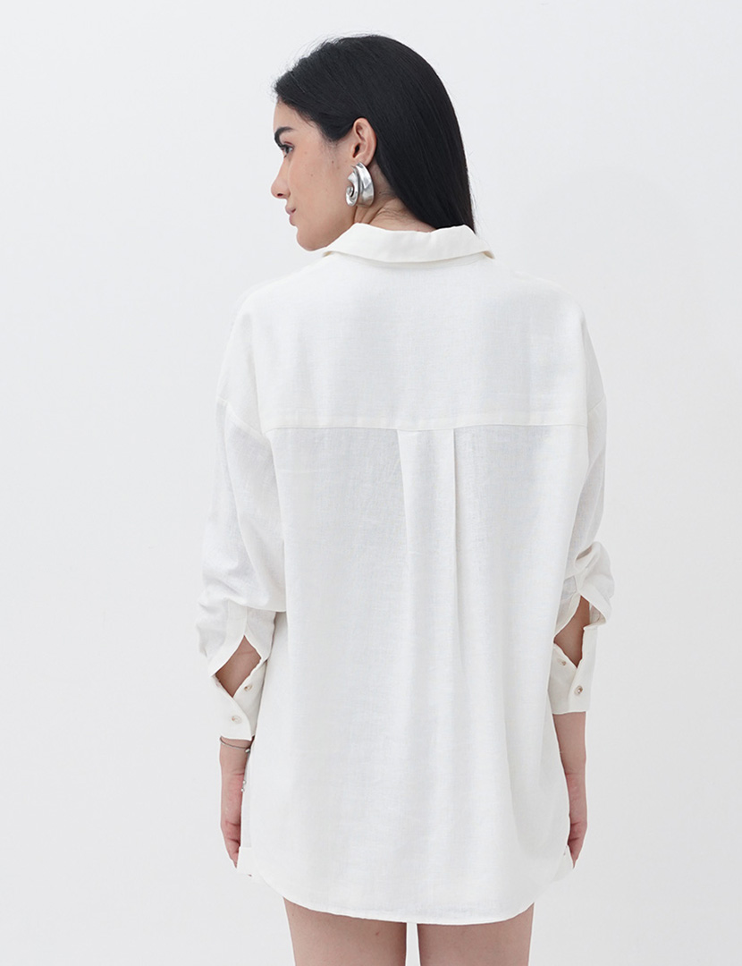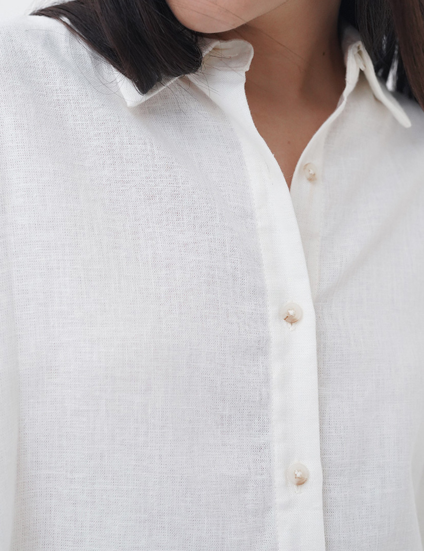 Shirt made of linen lapel collar and long sleeves, asymmetric hem with side vents, front button closure.