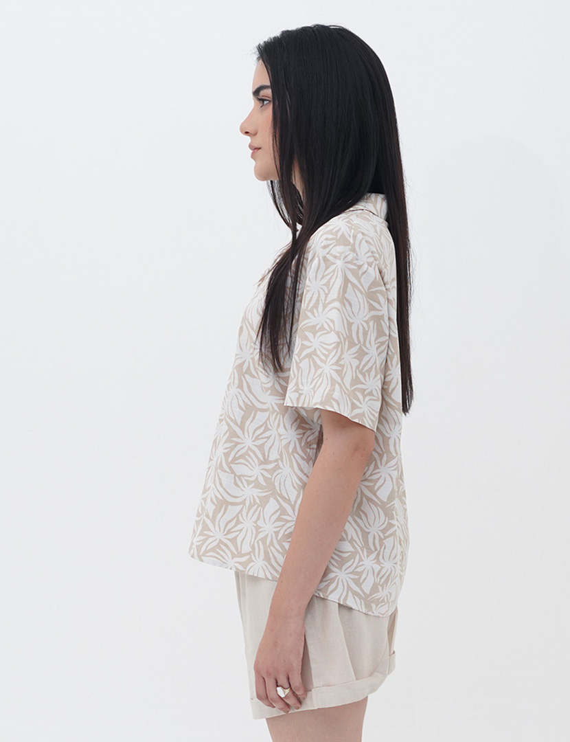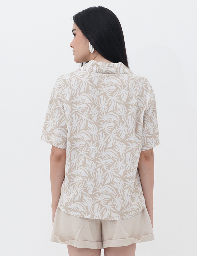 Oversize Pattern shirt with a lapel collar and V-neckline. Featuring short sleeves and button-up front.