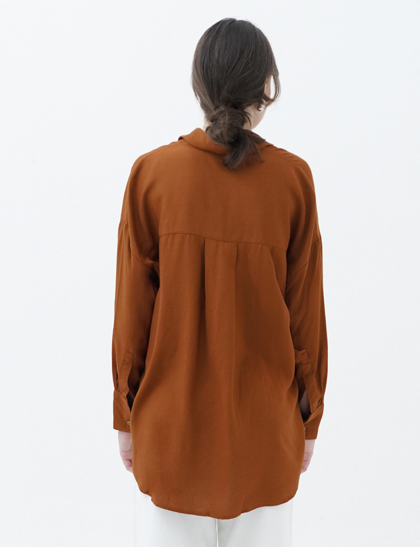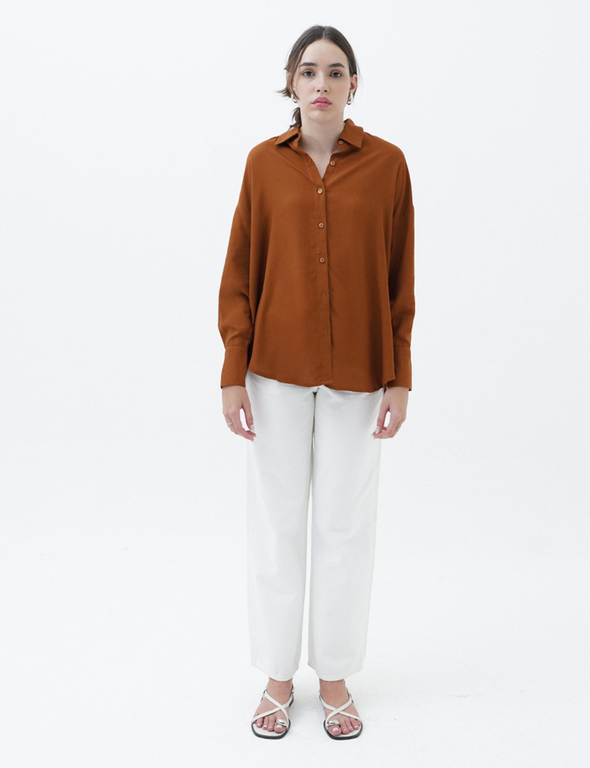 Oversized shirt with lapel collar, long sleeves, and buttoned cuffs. Asymmetric hem. Front button closure.
