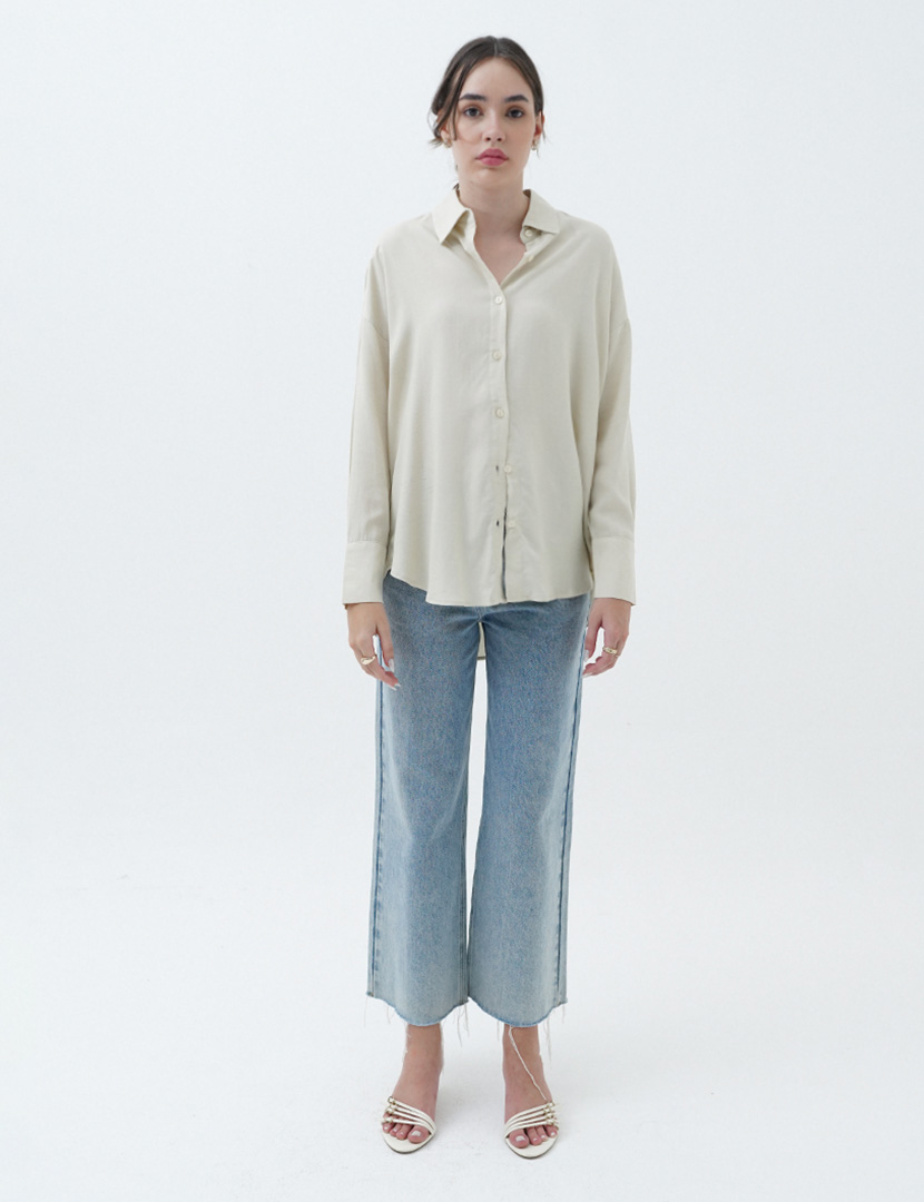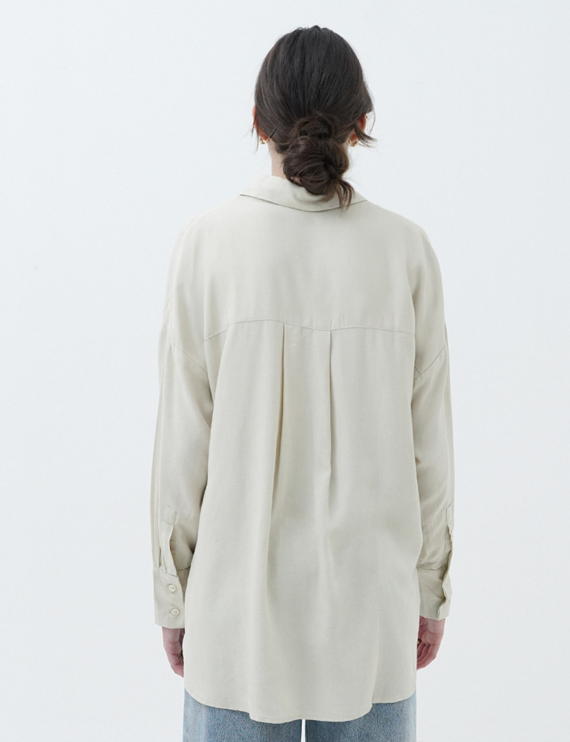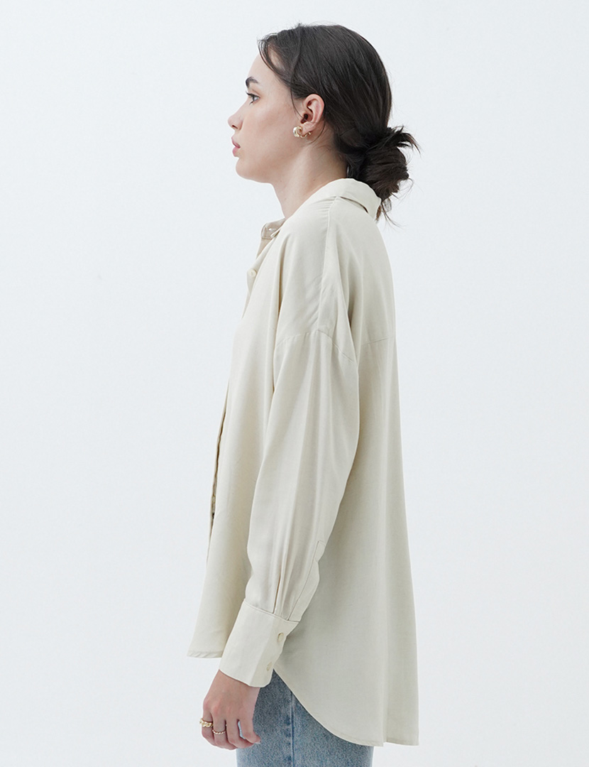 Oversized shirt with lapel collar, long sleeves, and buttoned cuffs. Asymmetric hem. Front button closure.