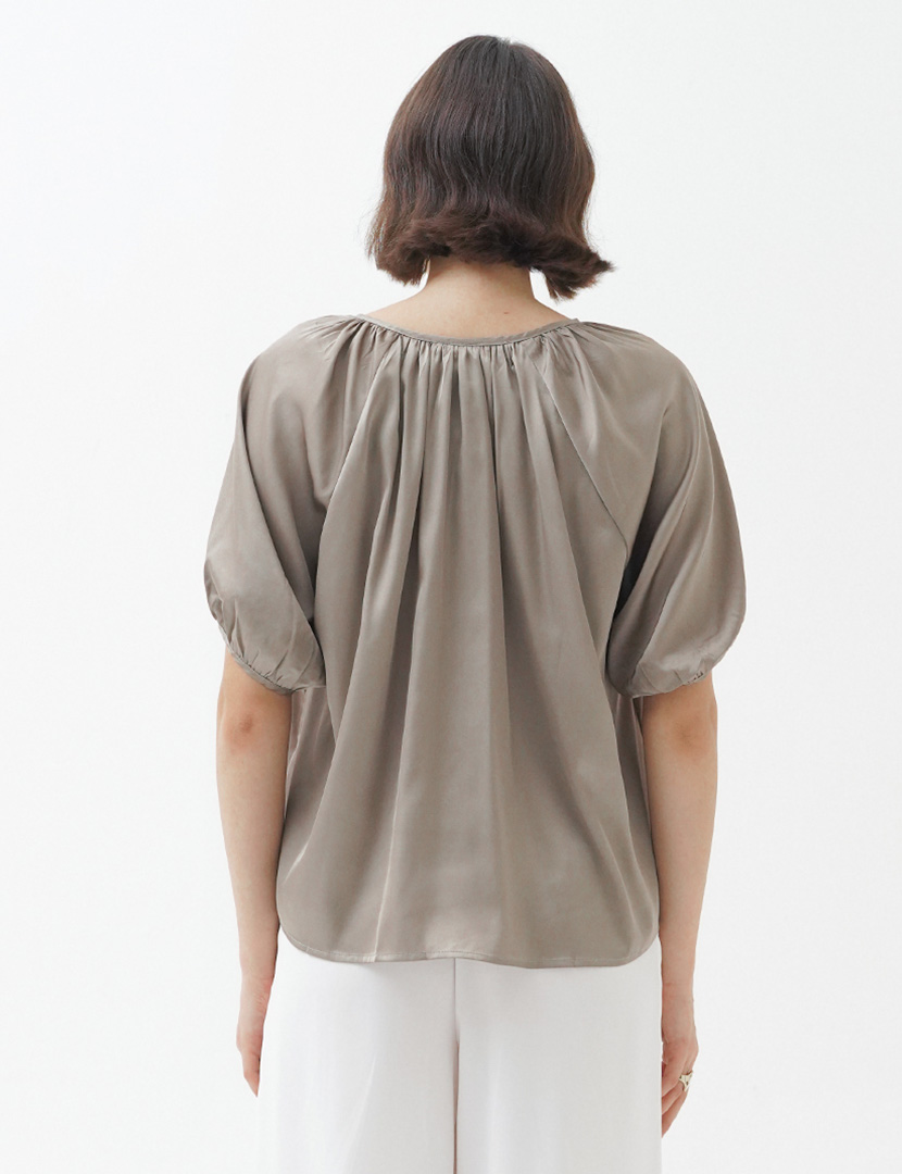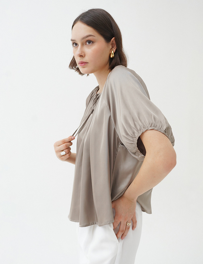 Oversized blouse with round neckline and narrow trim, v-shaped opening with narrow ties at top, elbow length sleeves, gathers at neckline and cuff for draped effect.