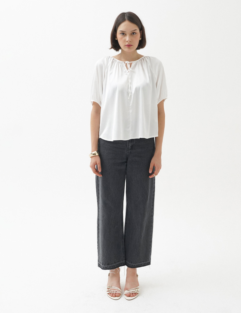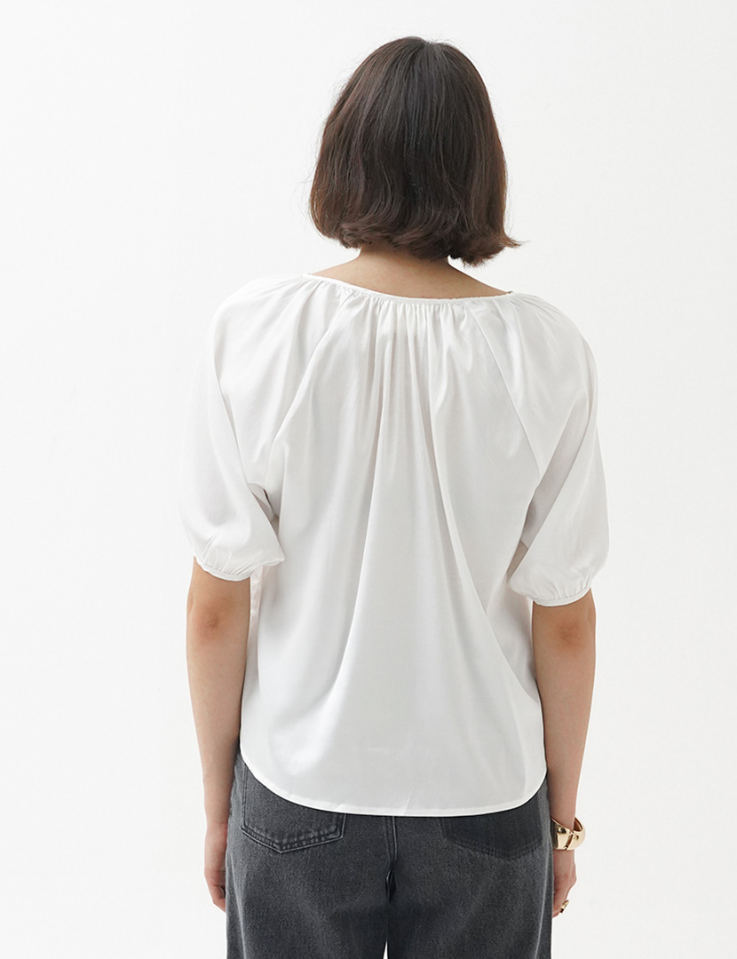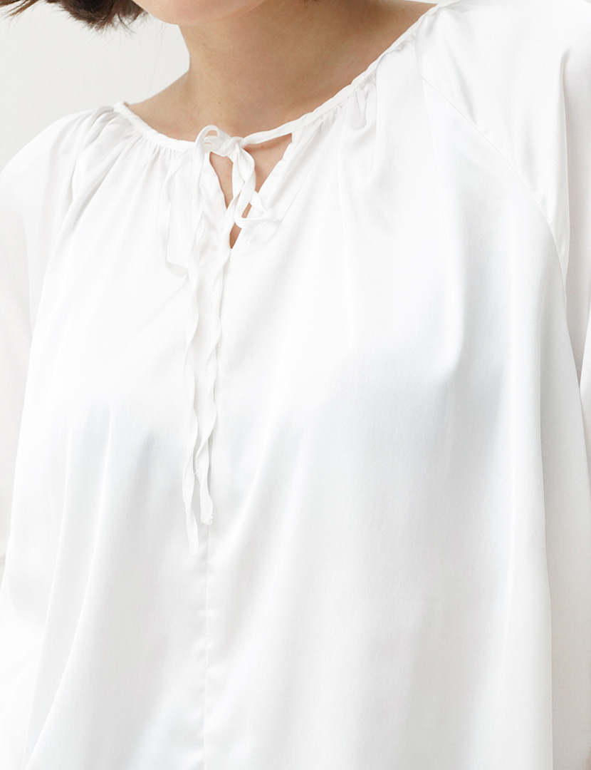 Oversized blouse with round neckline and narrow trim, v-shaped opening with narrow ties at top, elbow length sleeves, gathers at neckline and cuff for draped effect.
