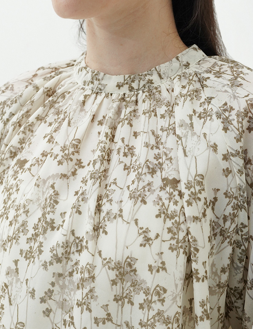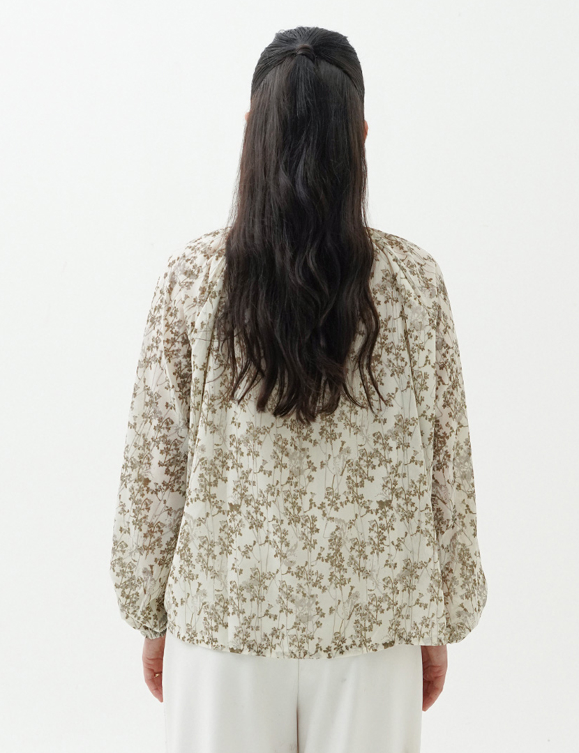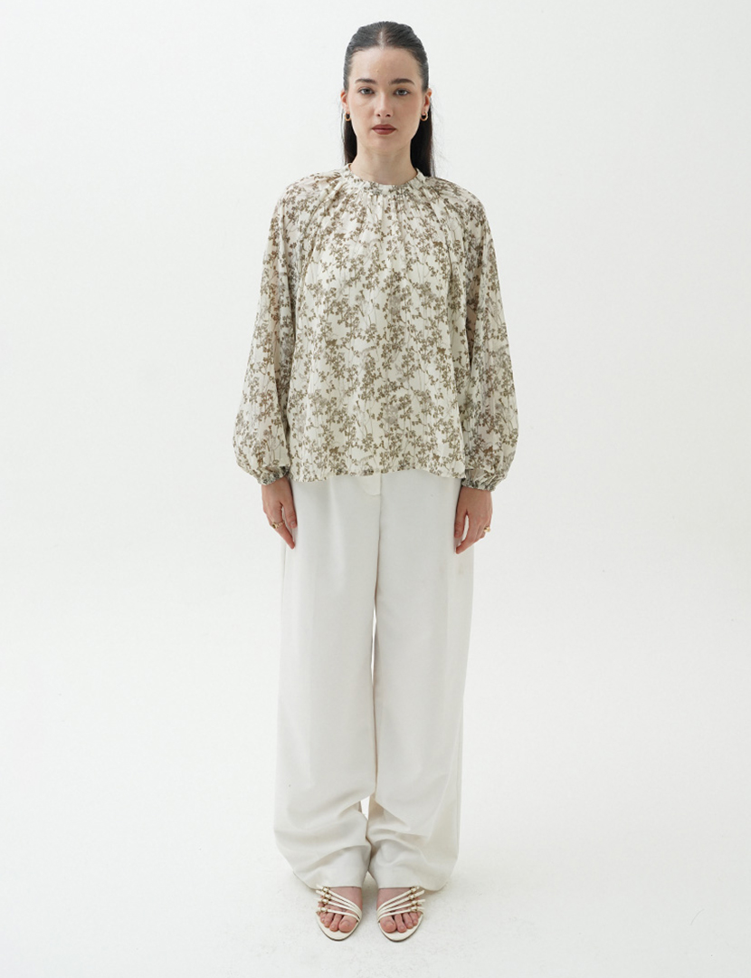 Loose-fit blouse with a crew neck, puff sleeves, and back button opening.