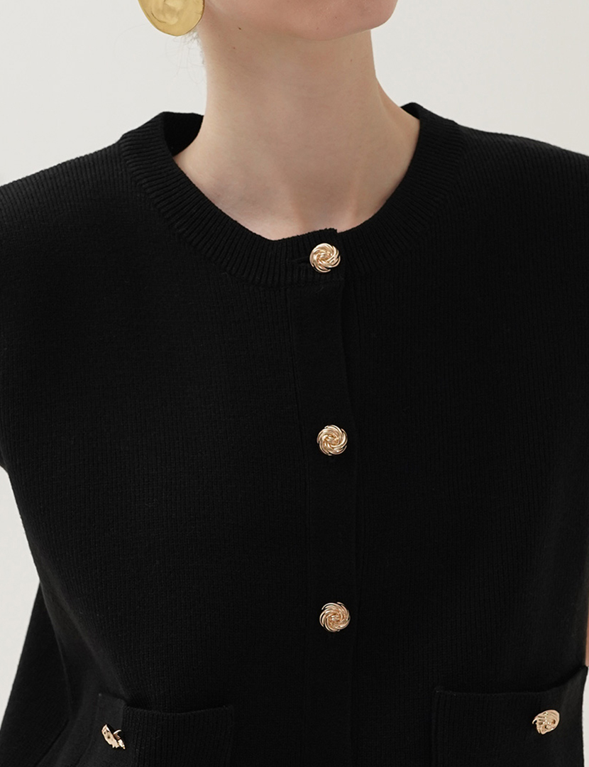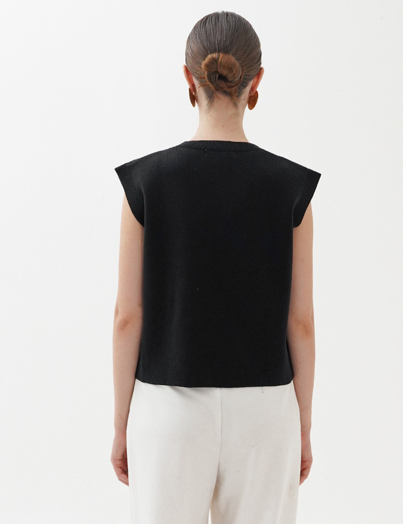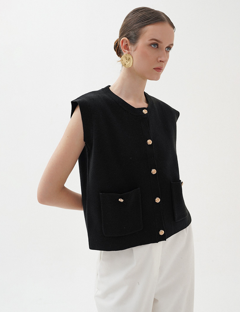 Sleeveless round neck vest top, front patch pockets, button-up front.