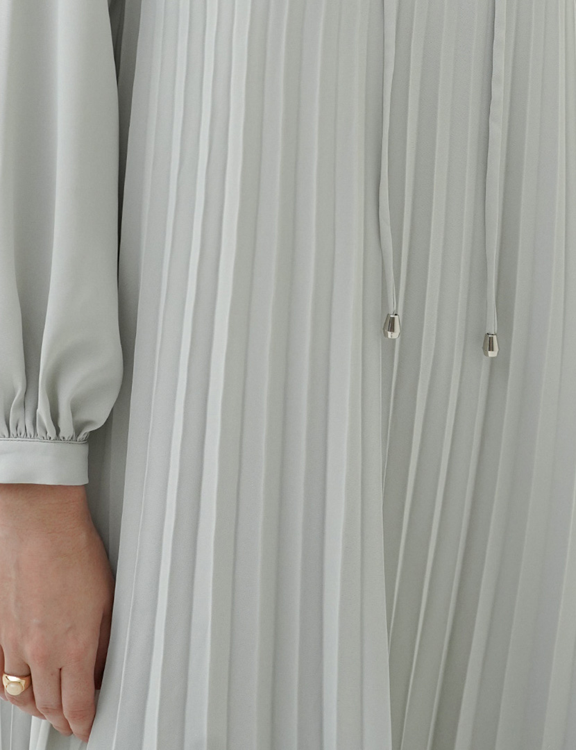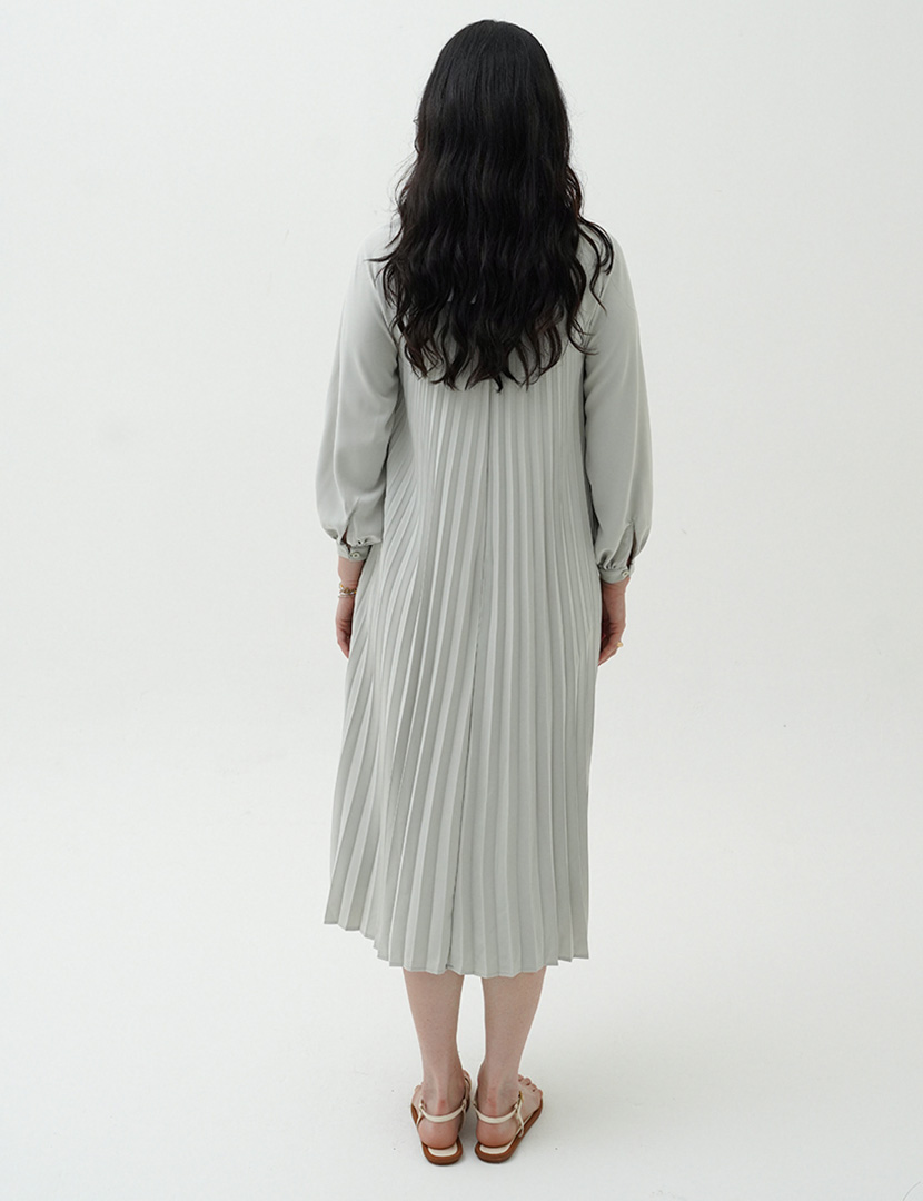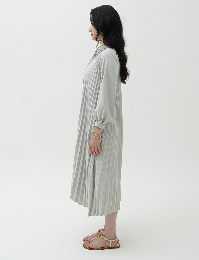 Midi dress in pleated sateen with a round neckline and concealed buttons at the top of the front. Long raglan sleeves, and narrow cuffs with covered buttons.