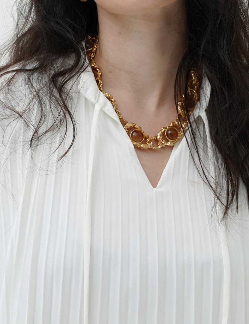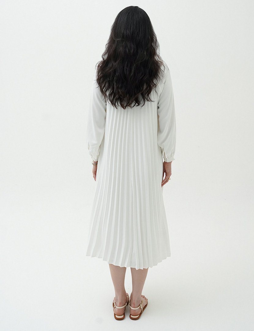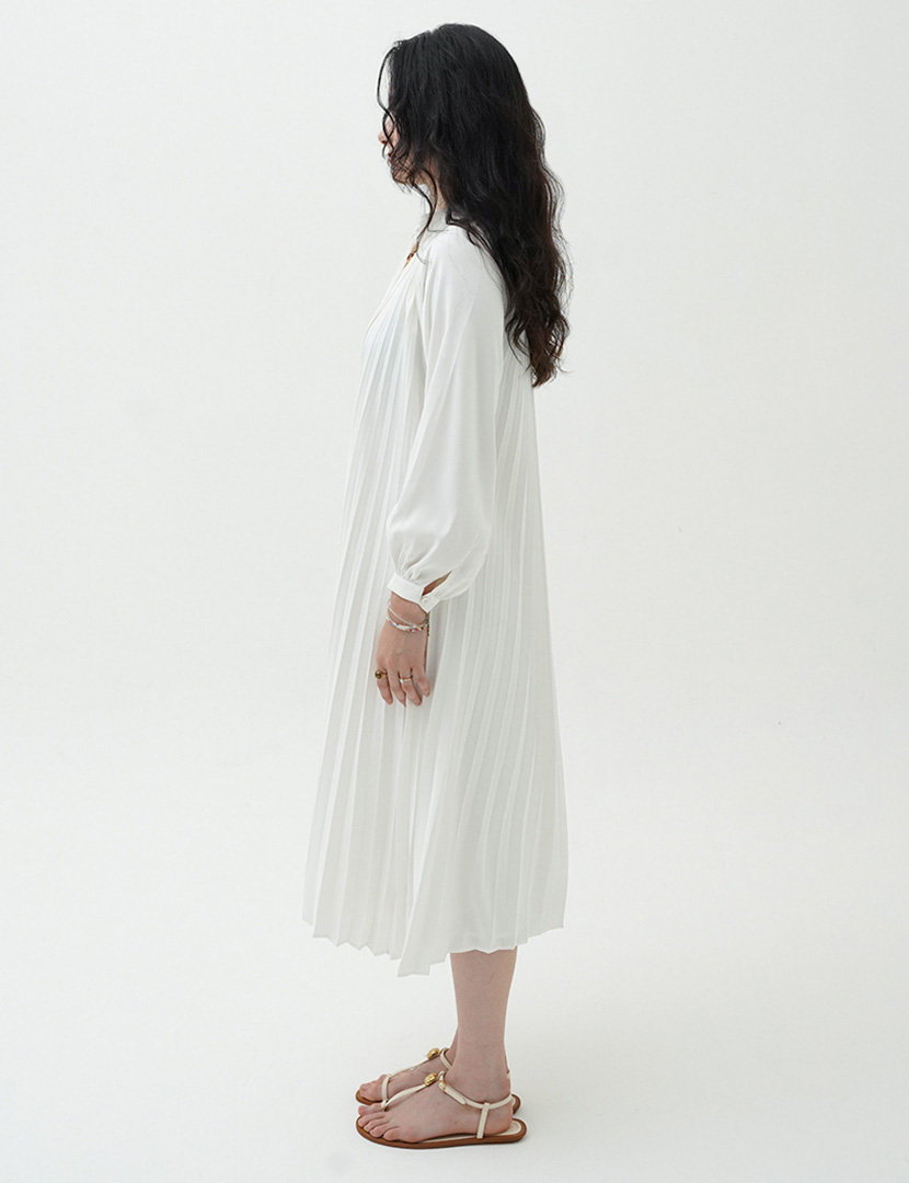 Midi dress in pleated sateen with a round neckline and concealed buttons at the top of the front. Long raglan sleeves, and narrow cuffs with covered buttons.