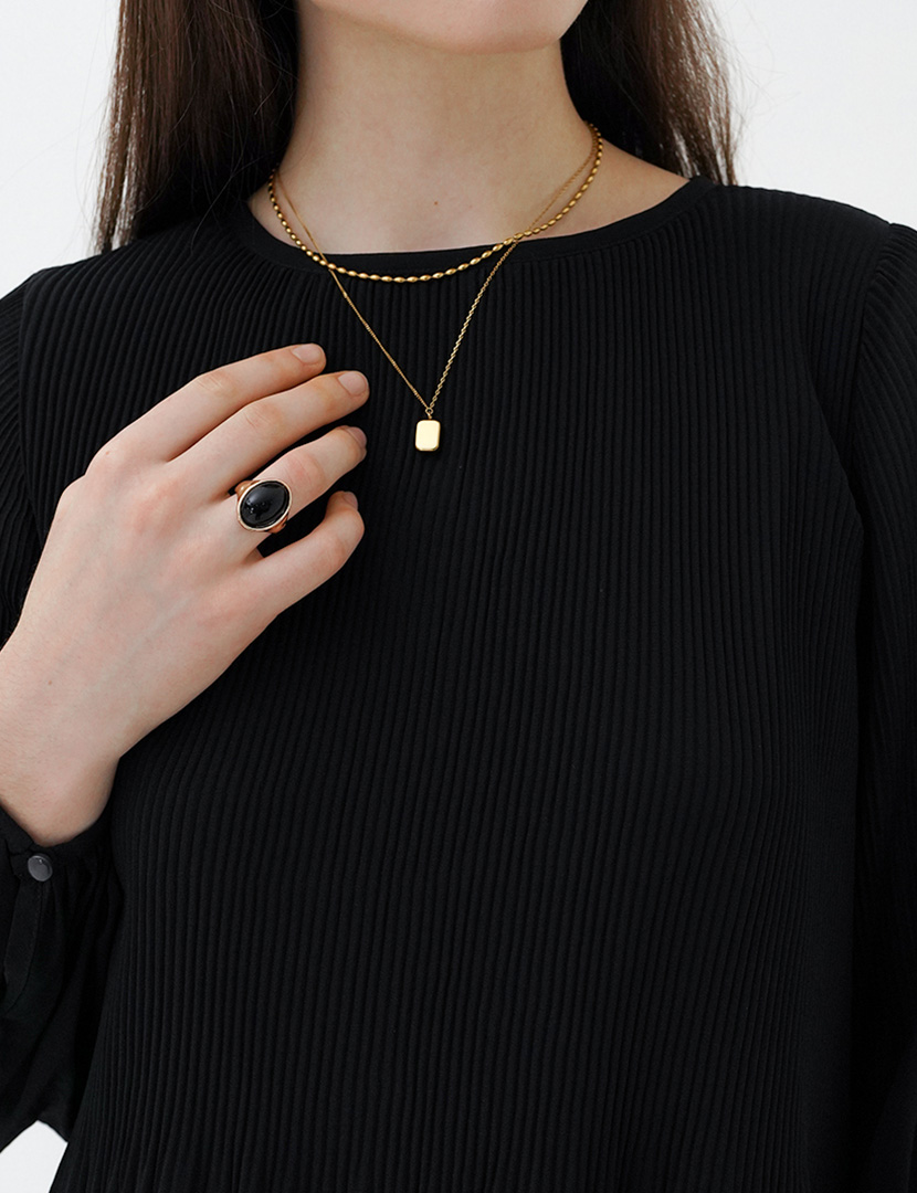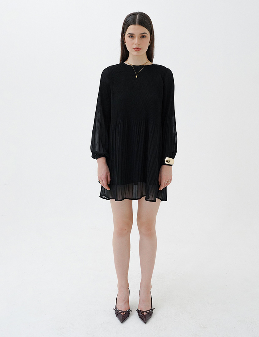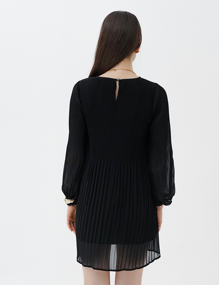 Dress with a crew-neckline and long sleeves, featuring pleated fabric detail.