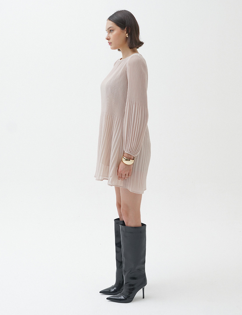 Dress with a crew-neckline and long sleeves, featuring pleated fabric detail.