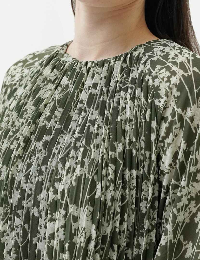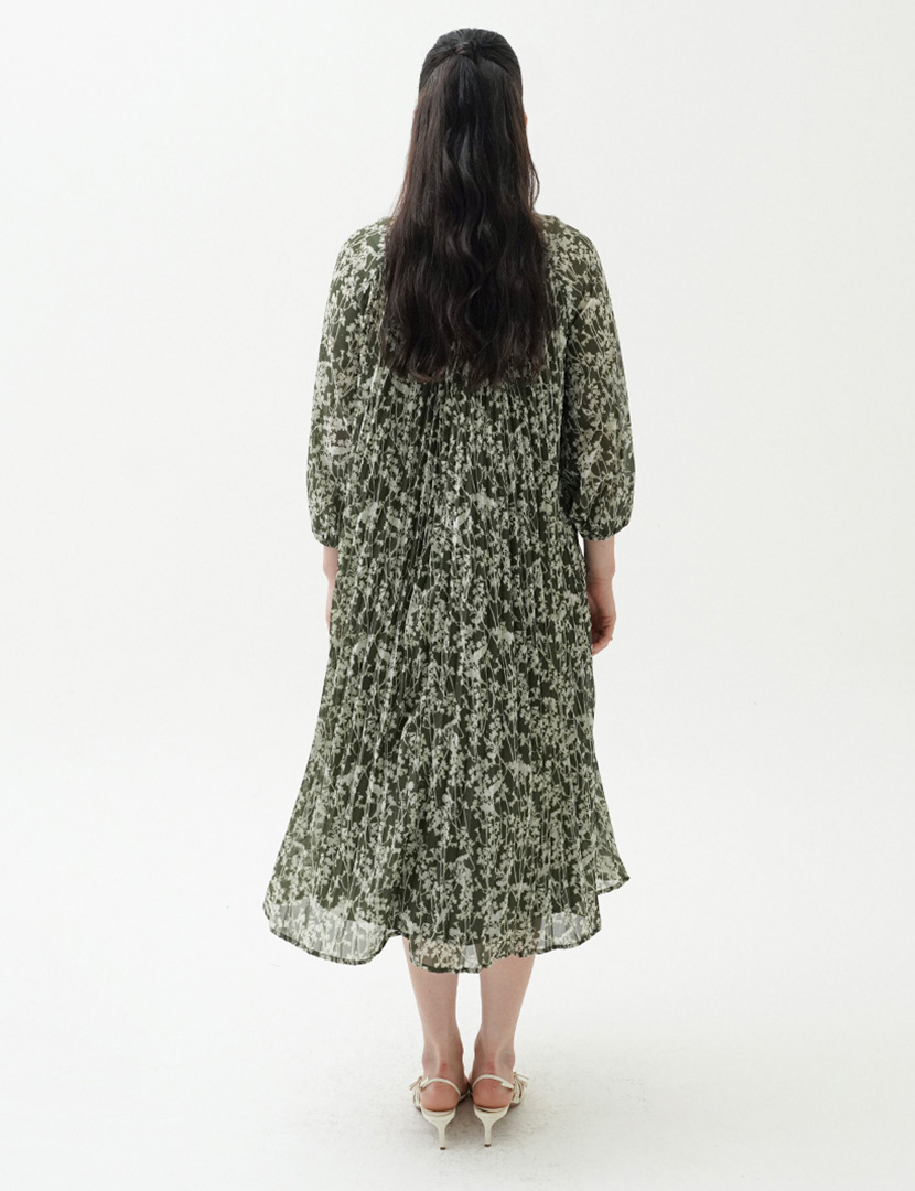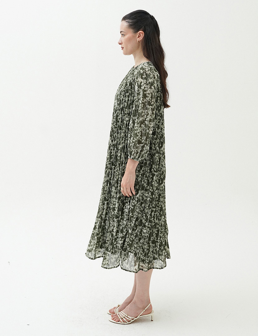 Midi pleated dress floral print in chiffon with pleated details on the body. raglan sleeve, and a-line sihouette.