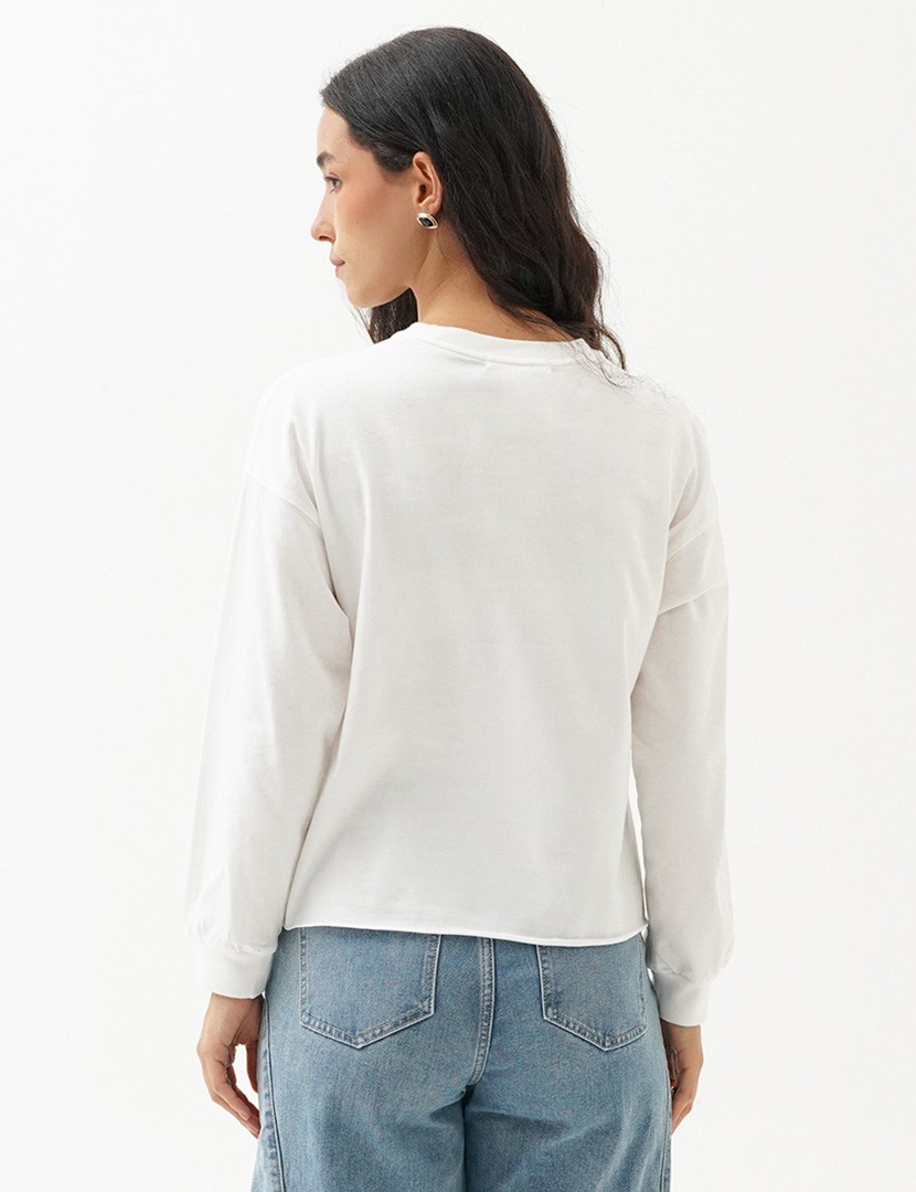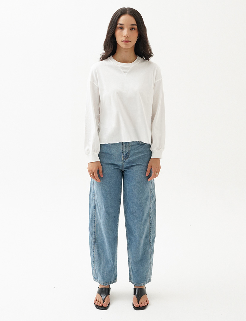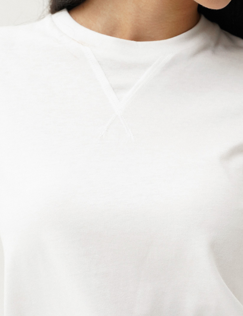 Round neck sweatshirt with drop-shoulder sleeves falling below the elbow, unfinished hem.