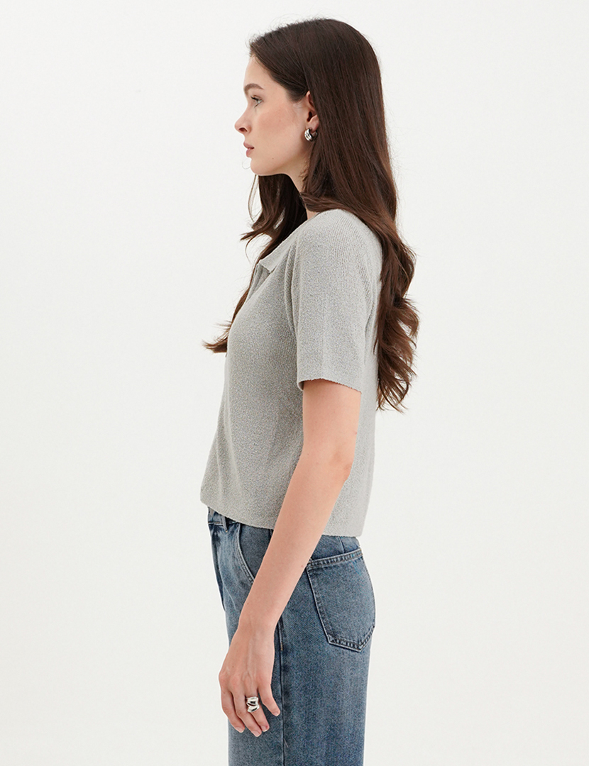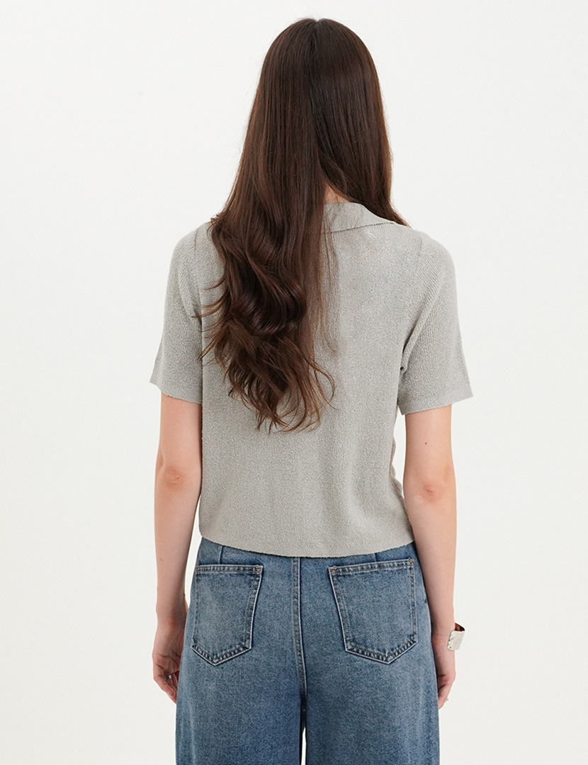 A collared neckline top with short sleeves, and a 2-way front zipper for opening.