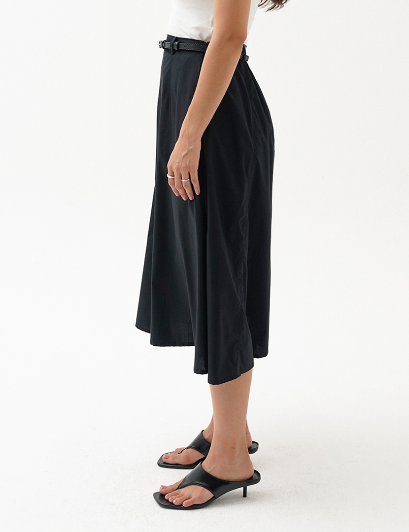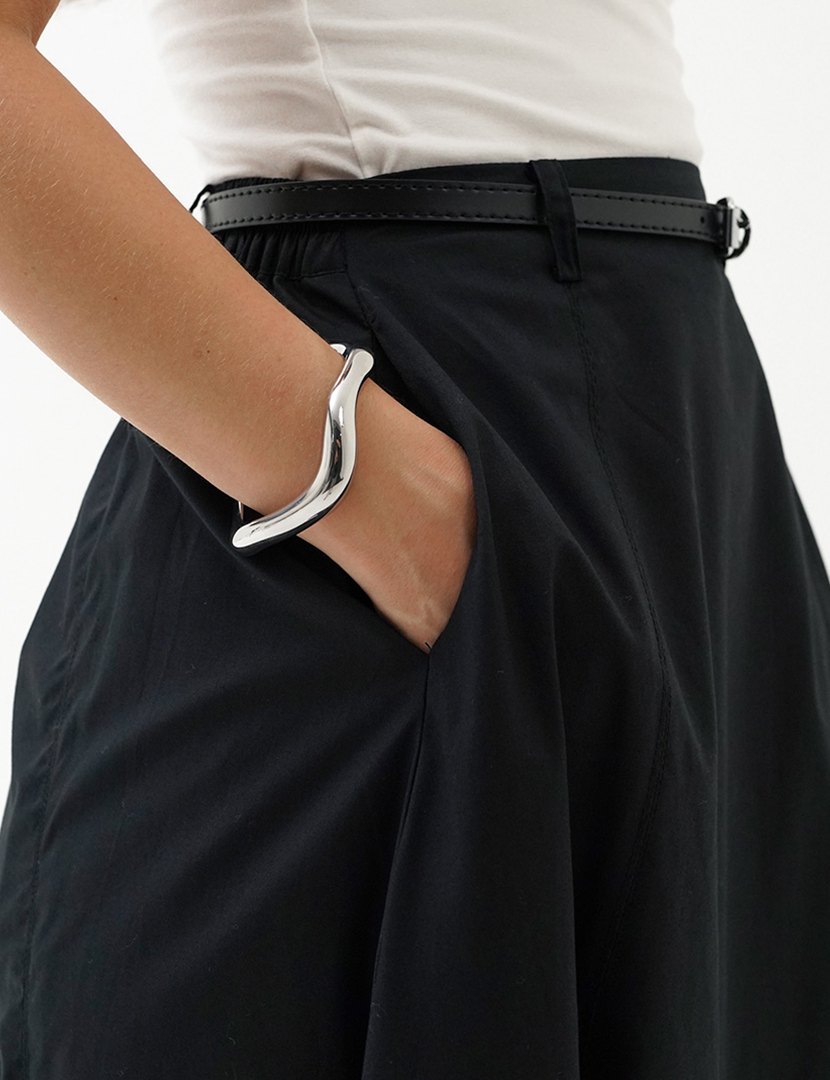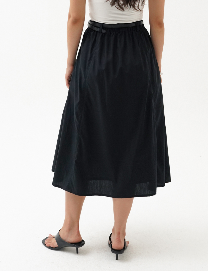 High-waist midi skirt. Side in-seam pockets, Elastic waist on the back, Invisible side zip fastening.