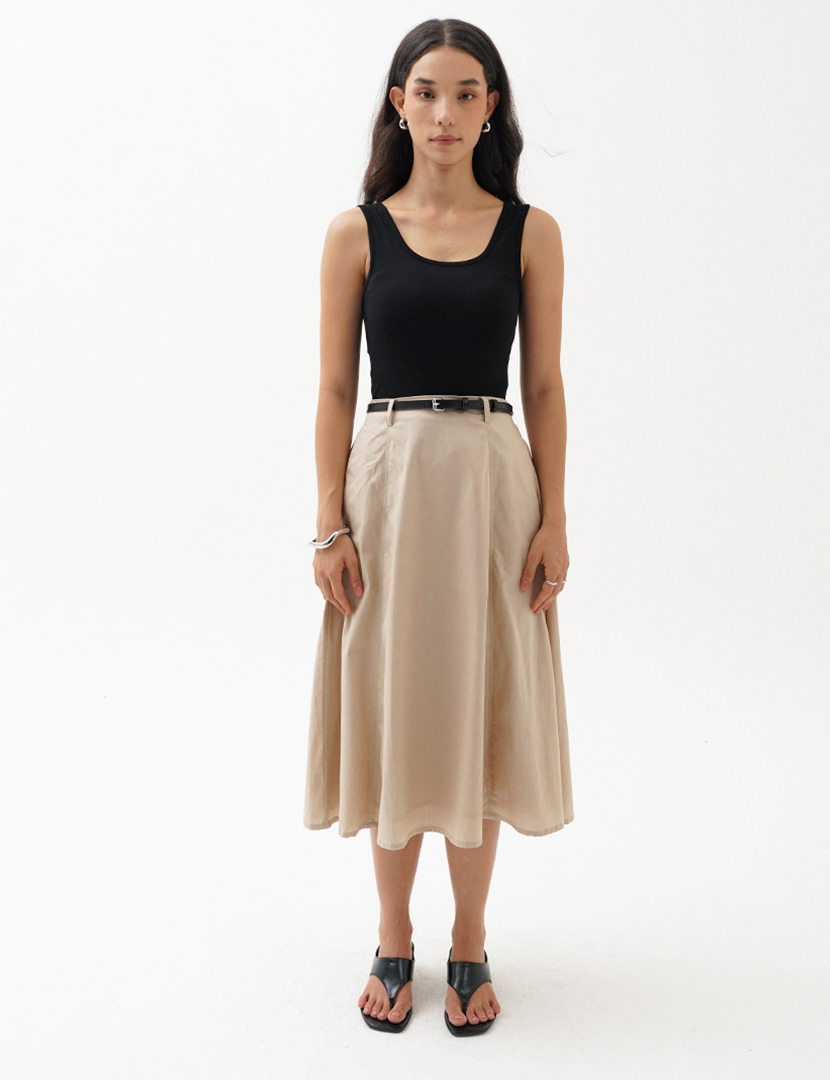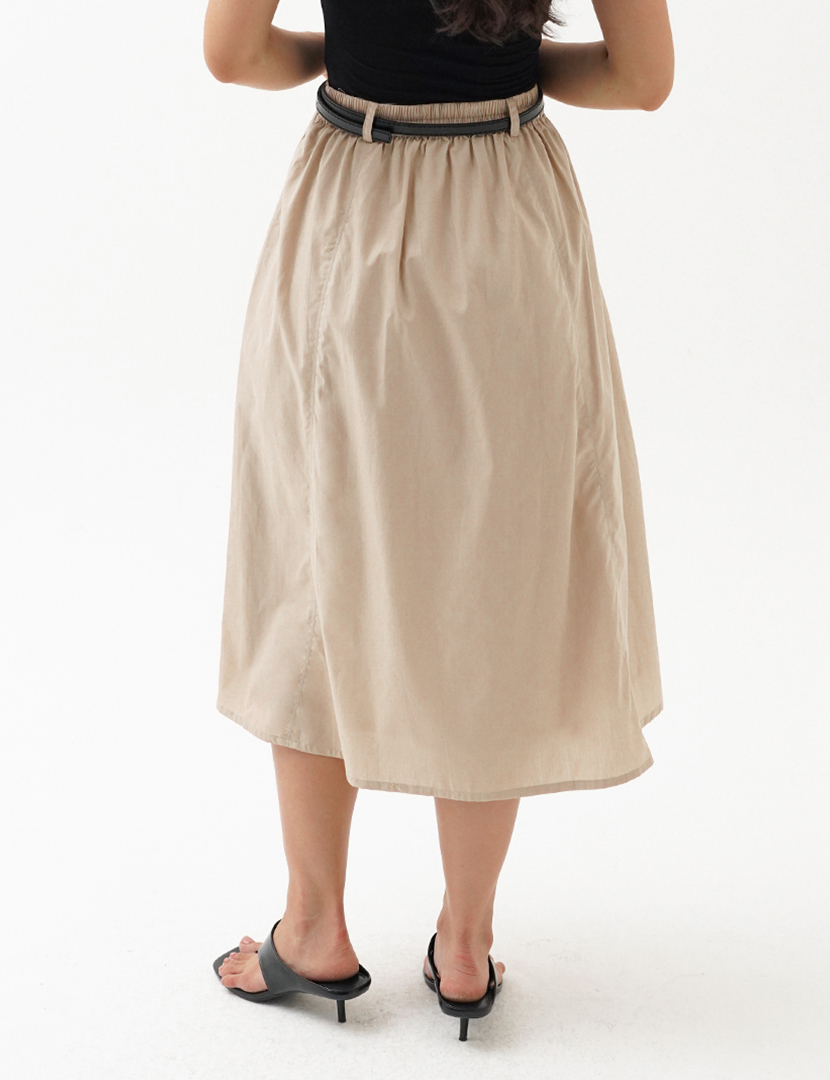 High-waist midi skirt. Side in-seam pockets, Elastic waist on the back, Invisible side zip fastening.
