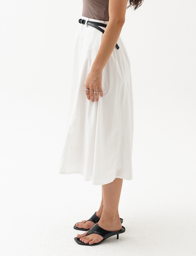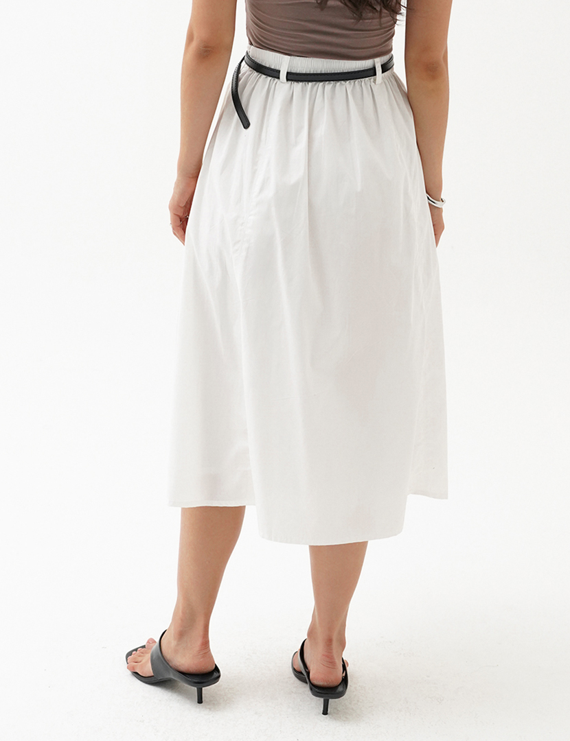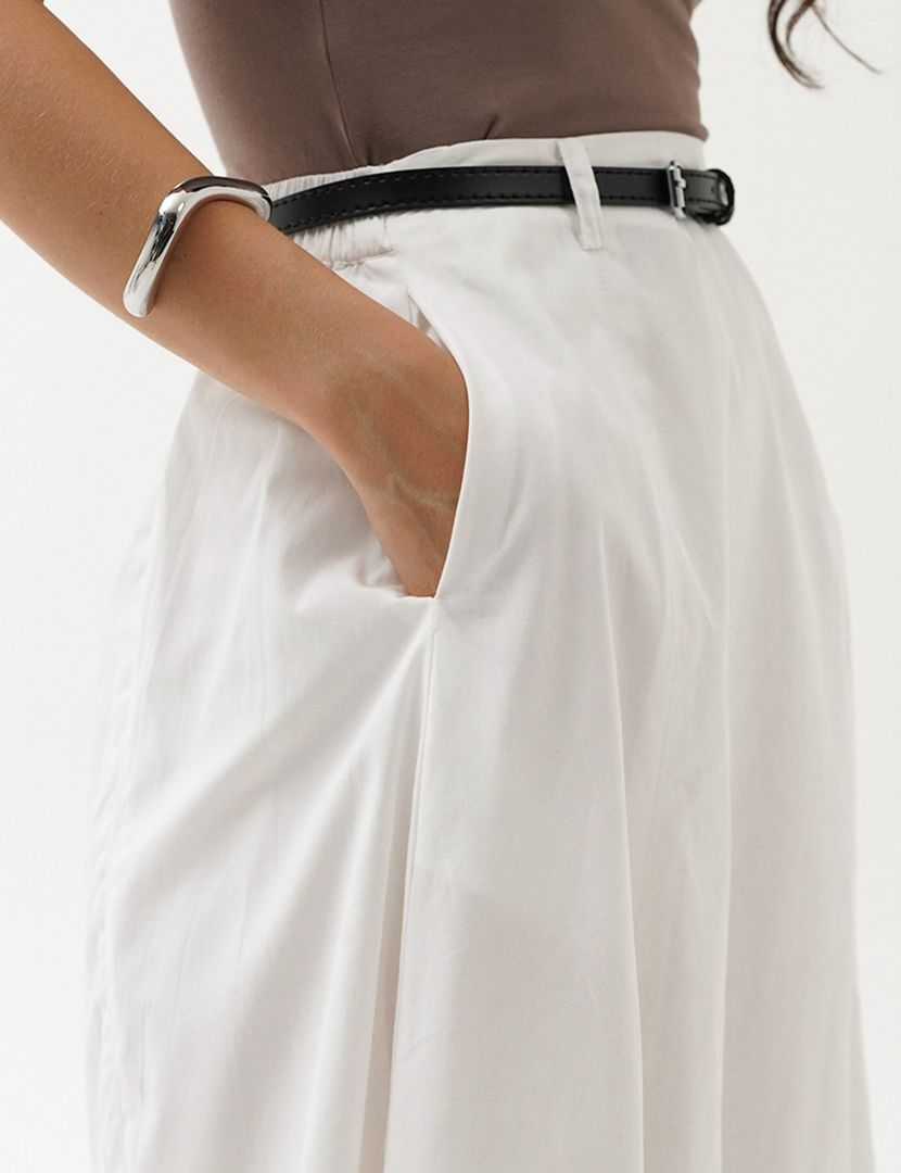 High-waist midi skirt. Side in-seam pockets, Elastic waist on the back, Invisible side zip fastening.