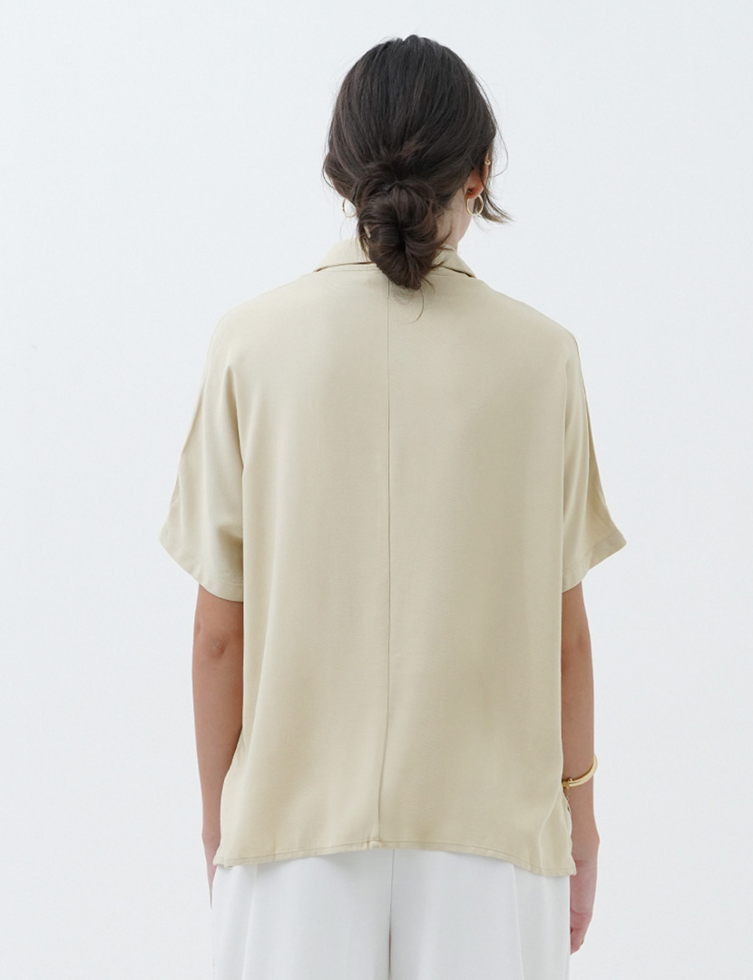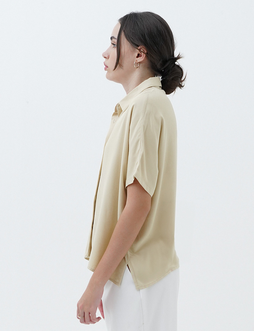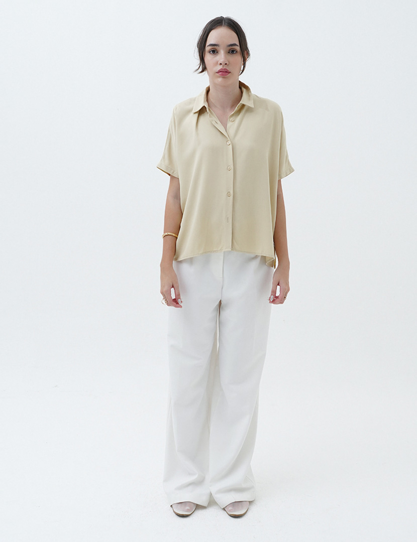 Collared shirt made of rayon twill. Short sleeves without stitching on it. Symmetric hem. Button-up front.