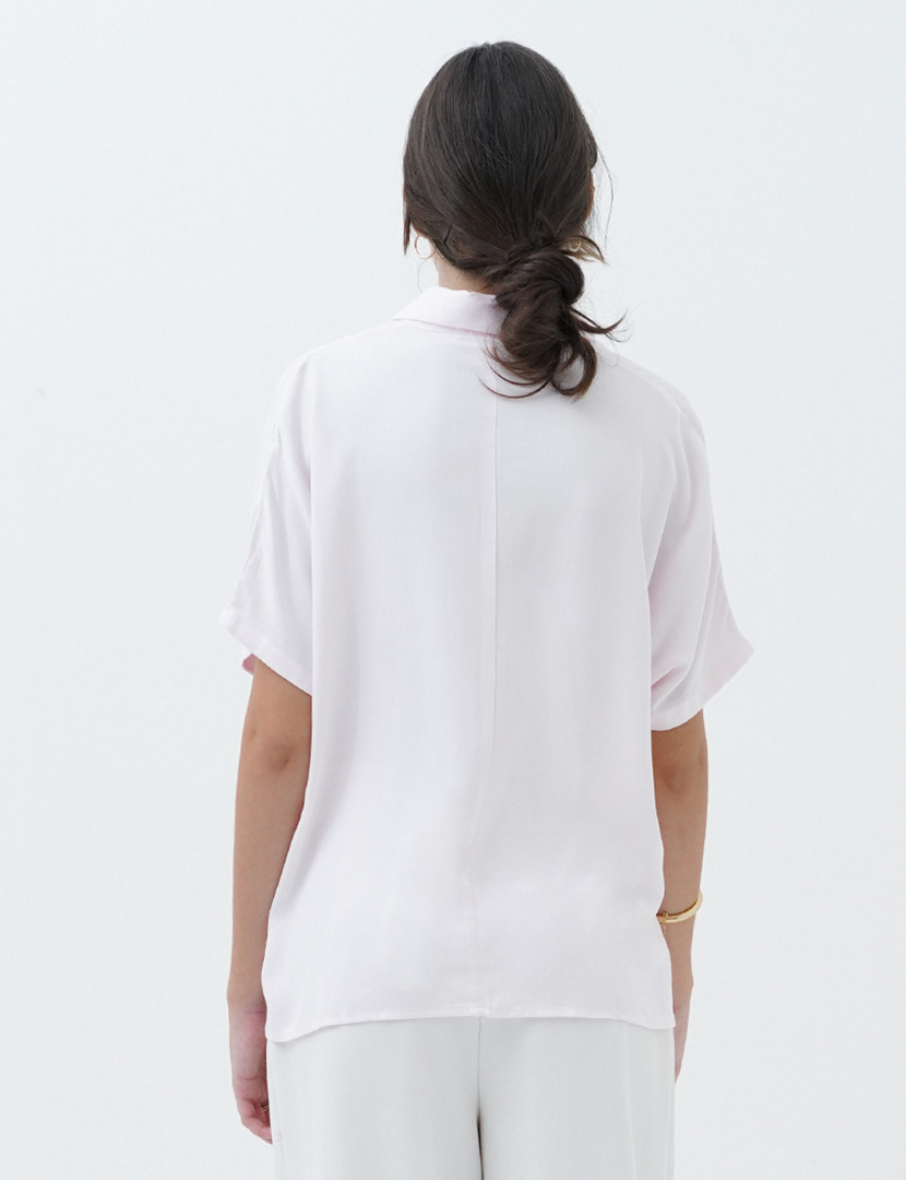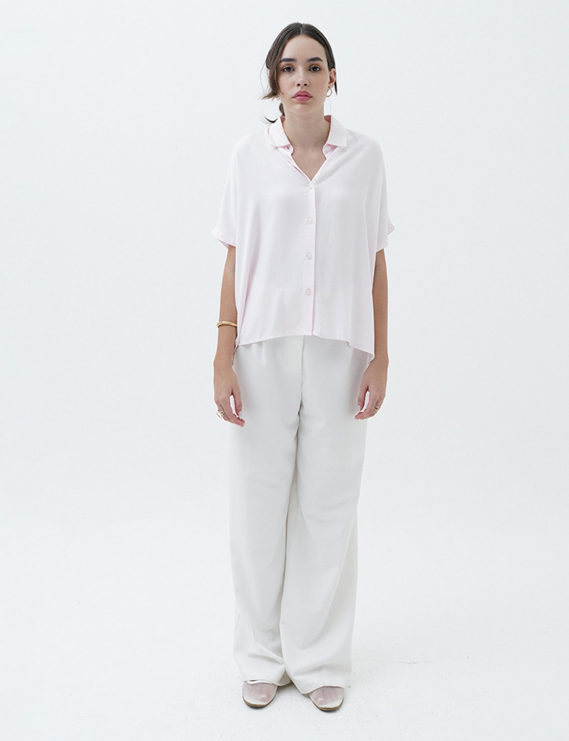 Collared shirt made of rayon twill. Short sleeves without stitching on it. Symmetric hem. Button-up front.