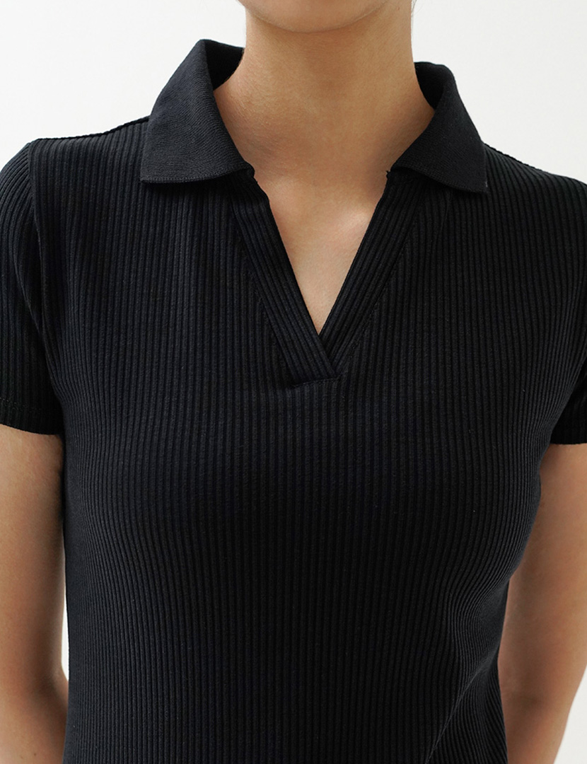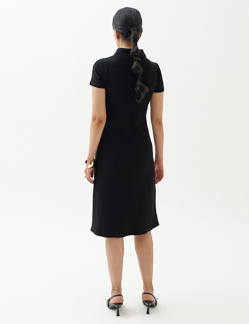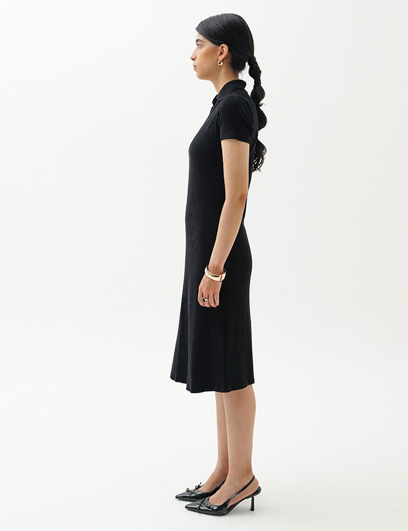 Ribbed midi dress with short sleeve. Fitted silhouette, and polo collar at the front.