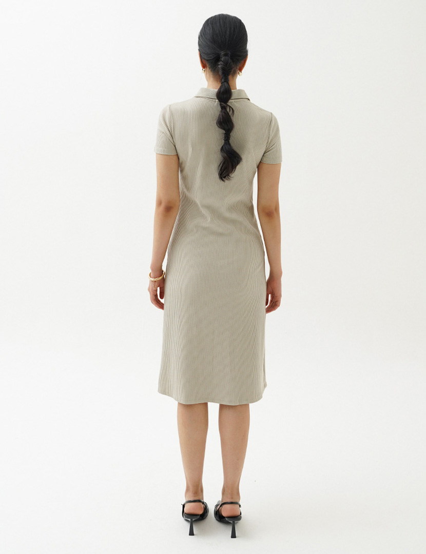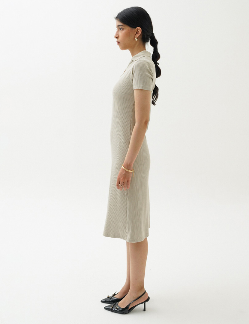 Ribbed midi dress with short sleeve. Fitted silhouette, and polo collar at the front.