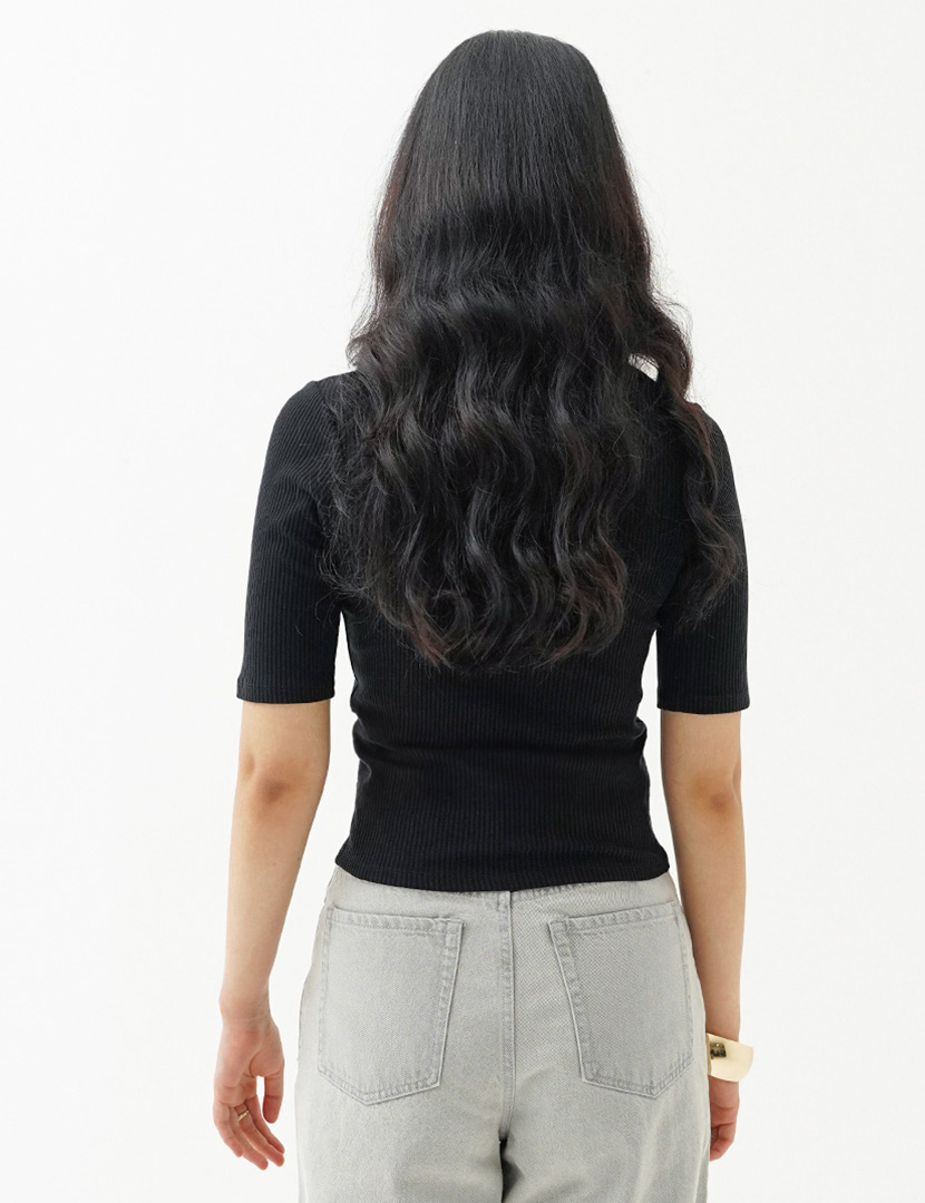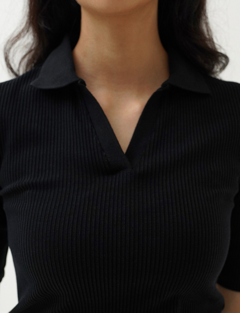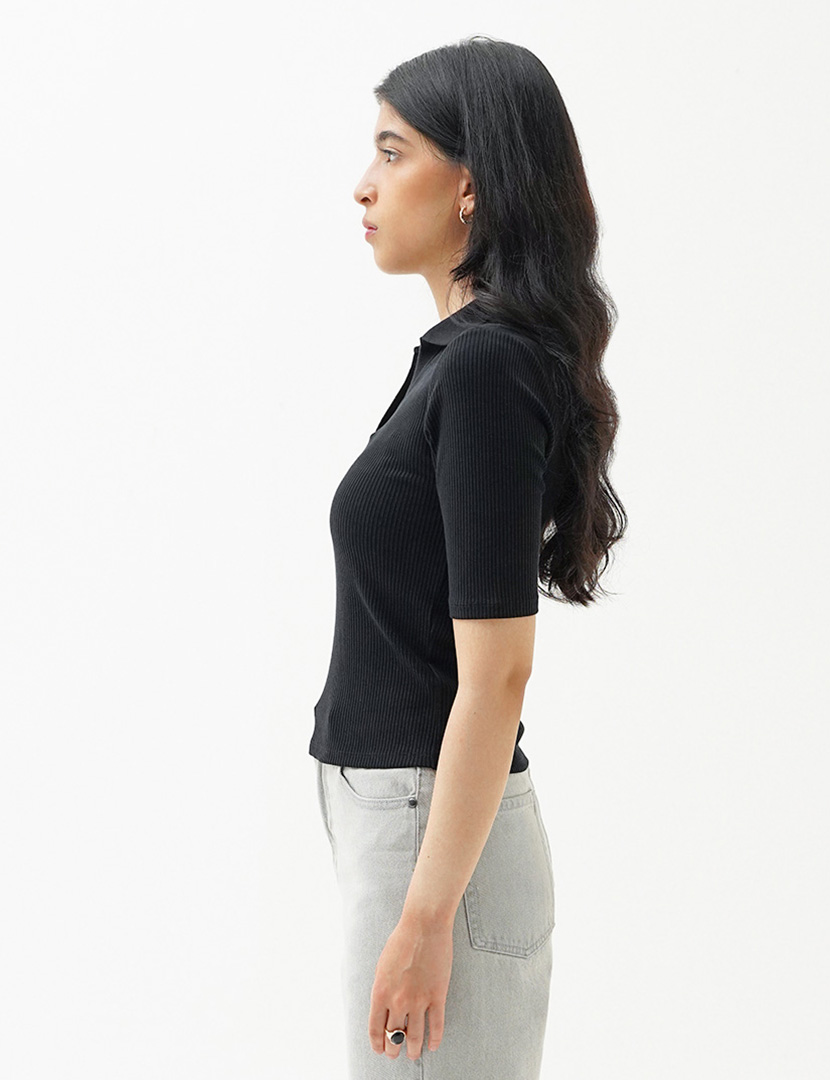 Ribbed Top with short sleeve and fitted silhouette, featuring polo collar at the front .
