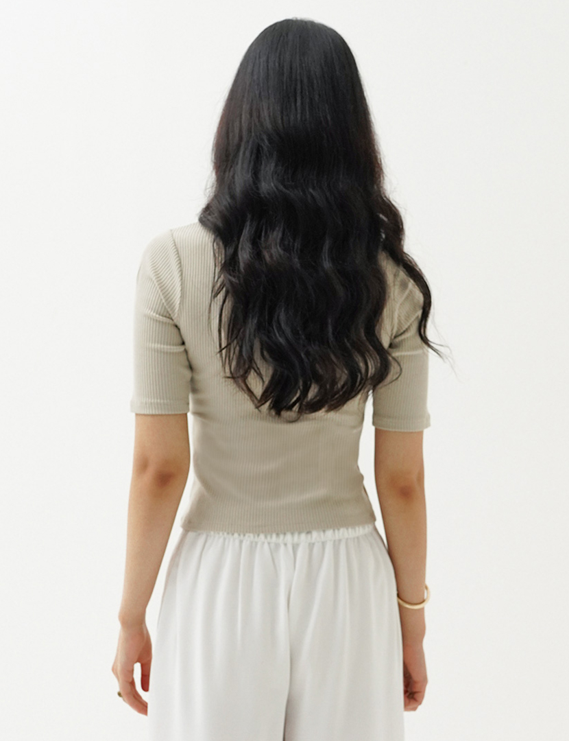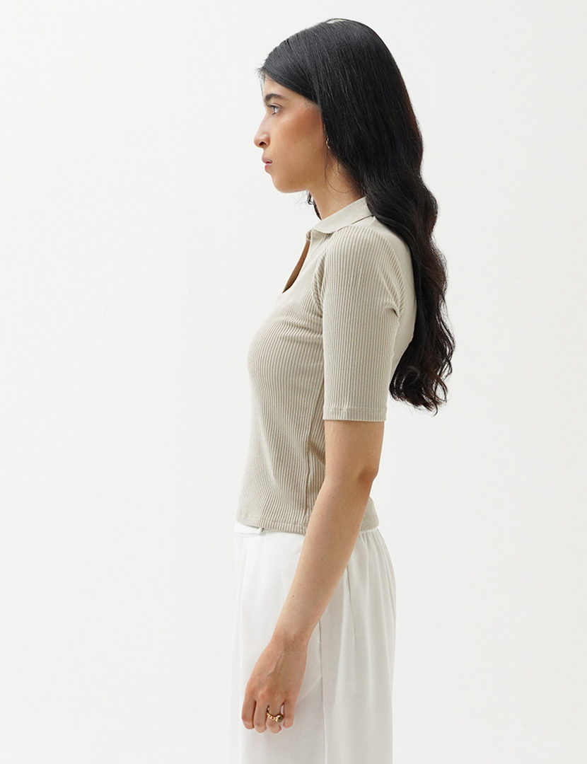 Ribbed Top with short sleeve and fitted silhouette, featuring polo collar at the front .
