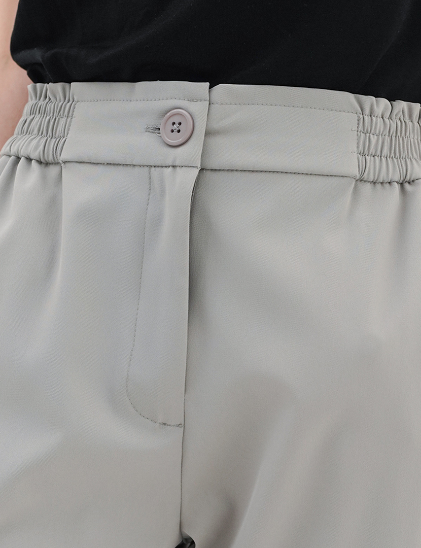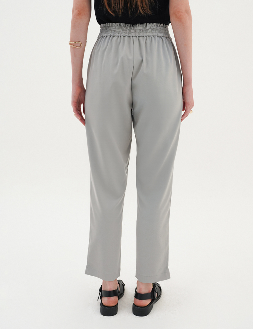 High-waist trousers with an elastic waistband and adjustable drawstrings. Front pockets roll up hem.