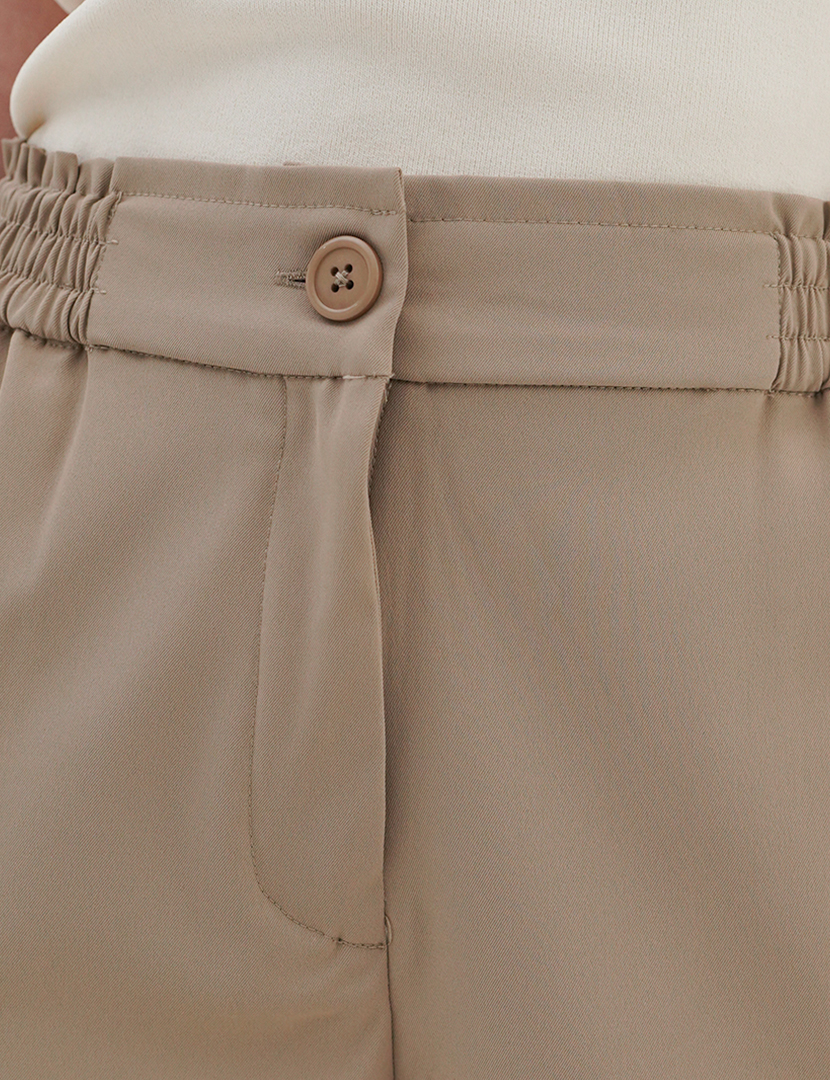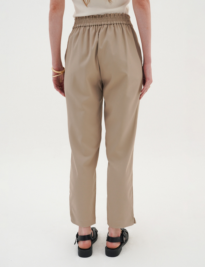 High-waist trousers with an elastic waistband and adjustable drawstrings. Front pockets roll up hem.