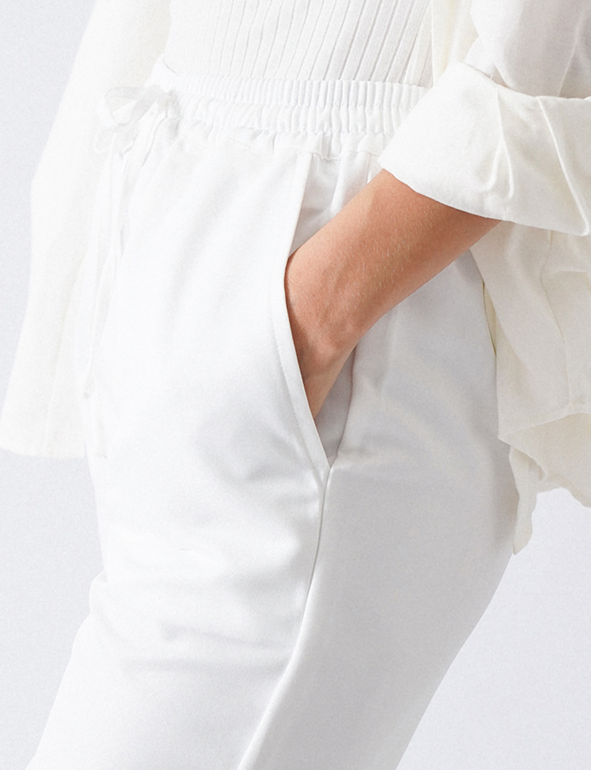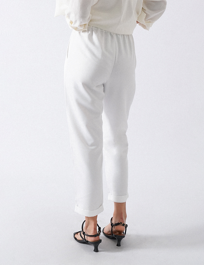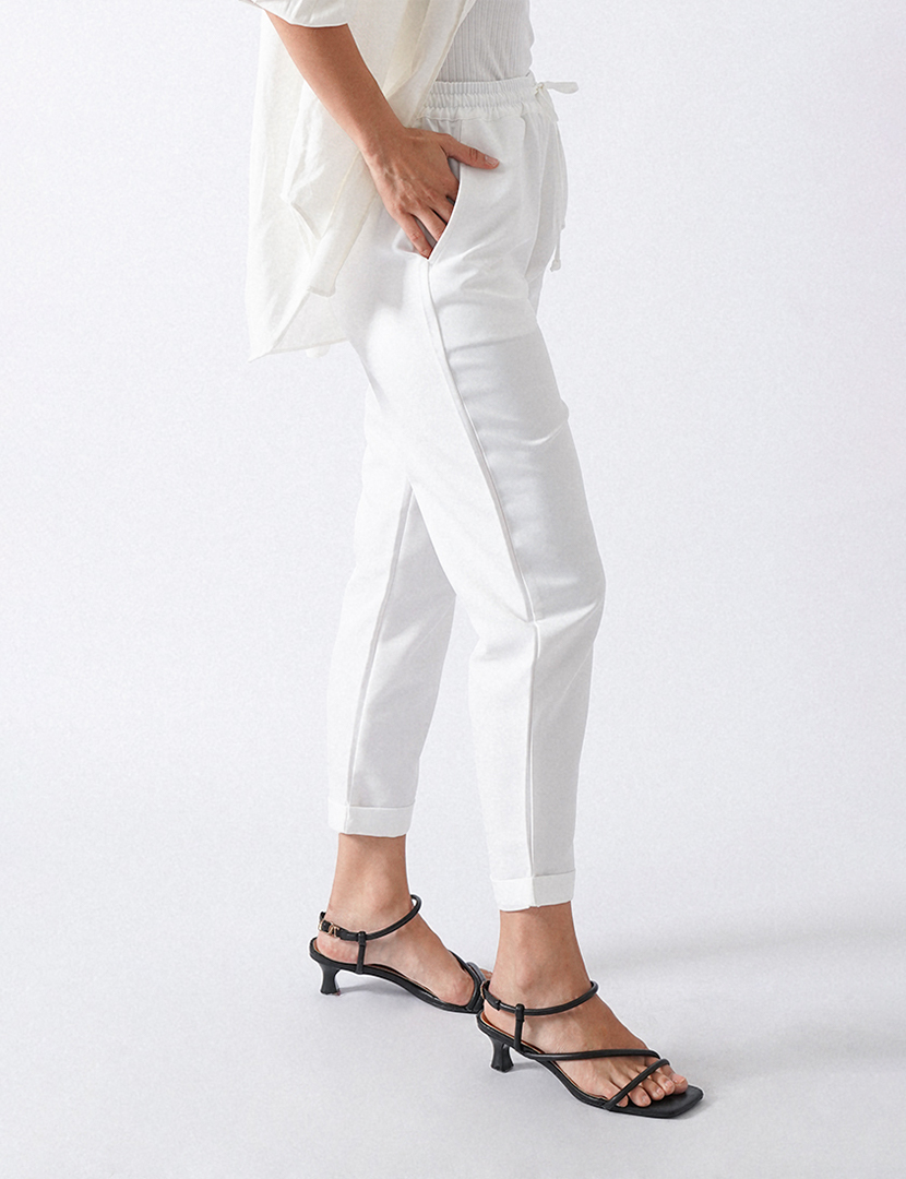 High waist trousers with an elastic waistband and adjustable drawstrings, front pockets roll up hem.