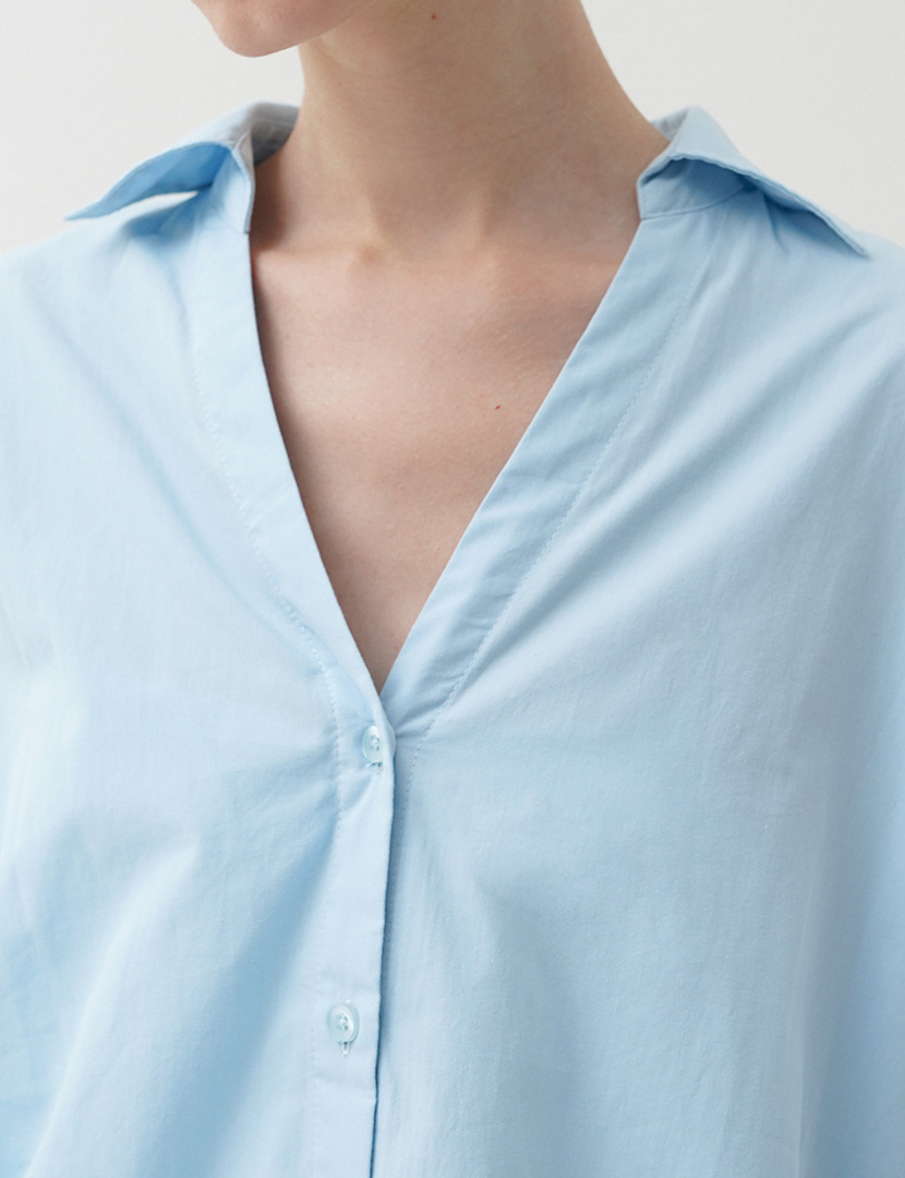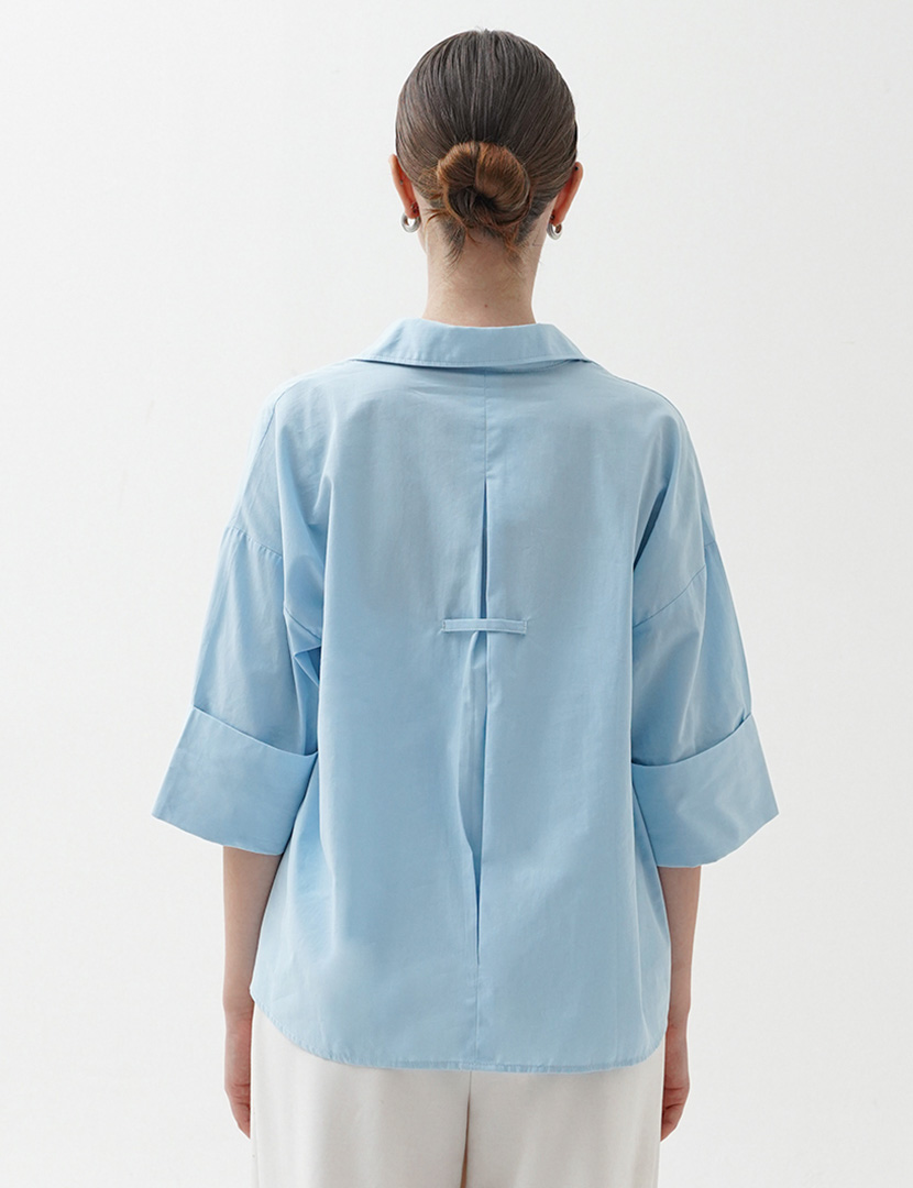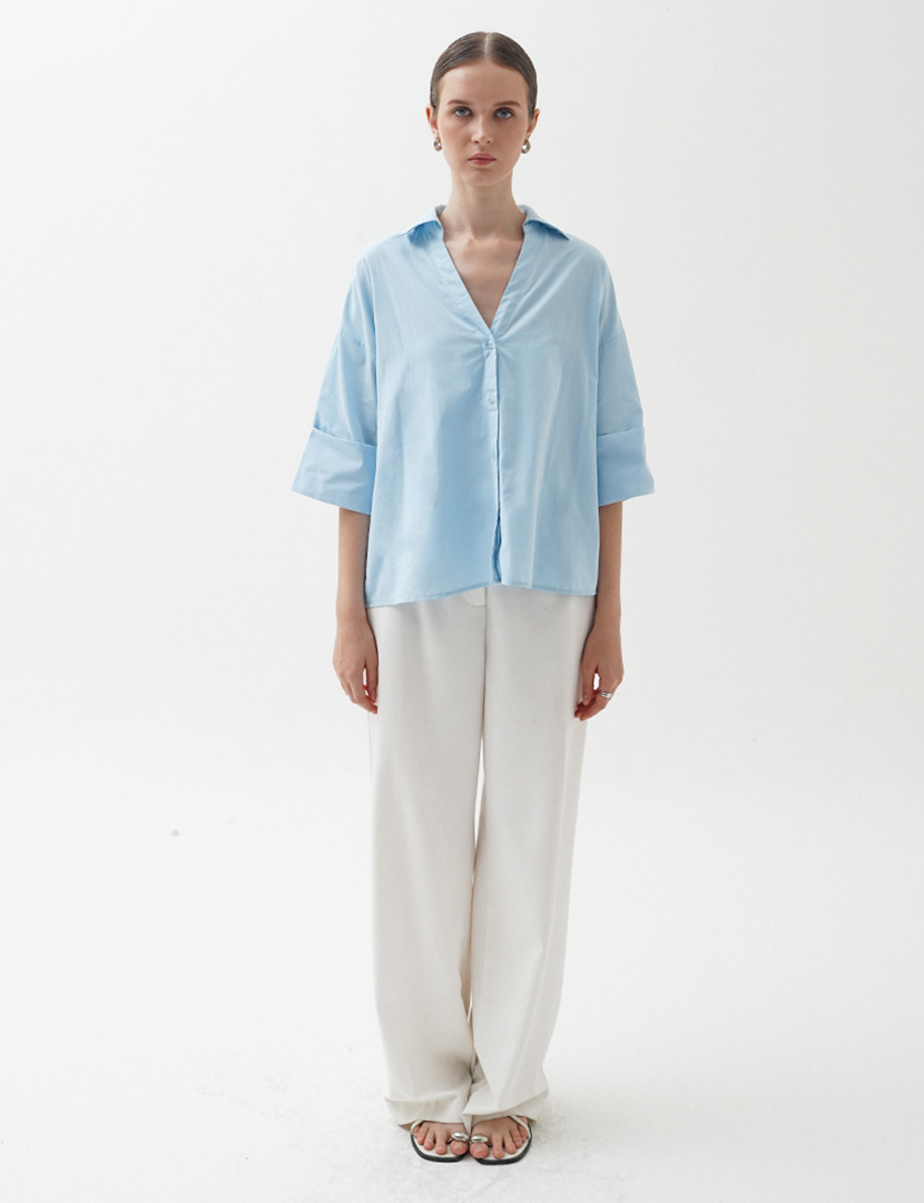 Lapel collar with v-neckline and wide sleeves with rolled up style, symmetrical bottom, button front closure.
