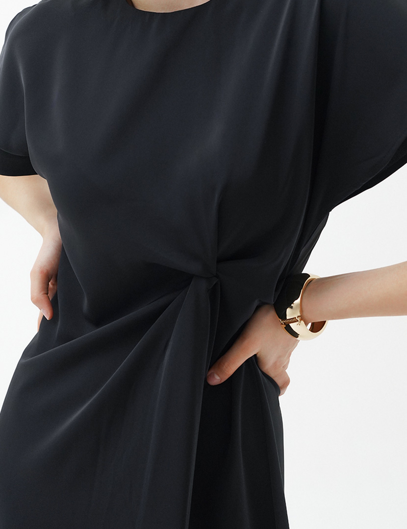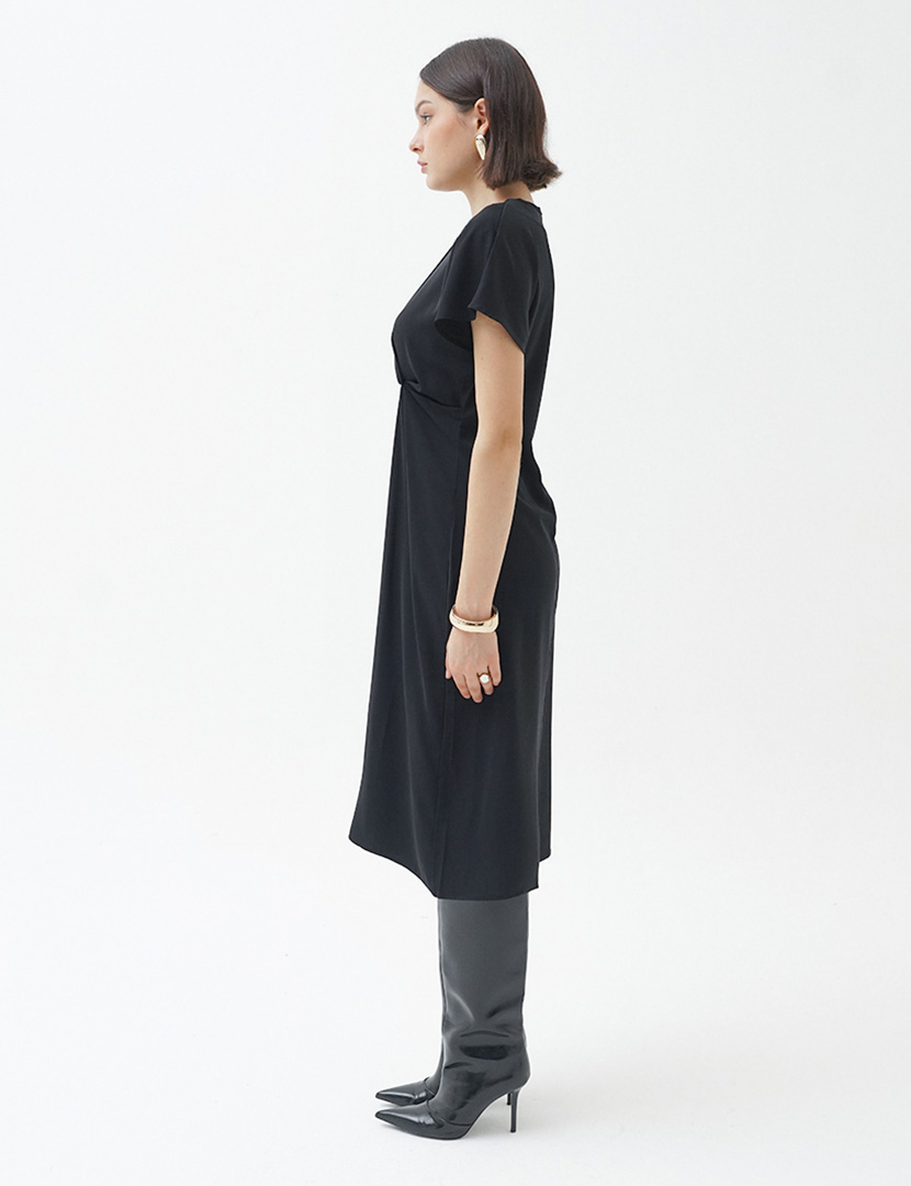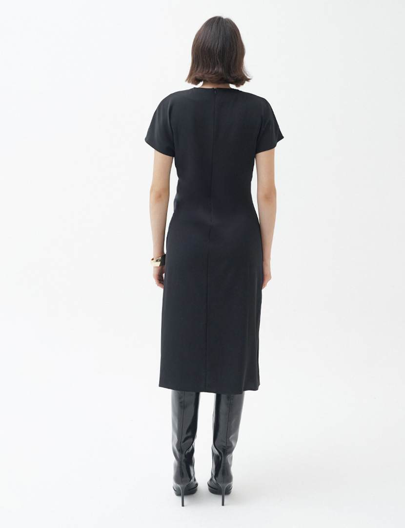 Round neck dress with short sleeves, fitted waist with gathered front, zipper opening at the back.